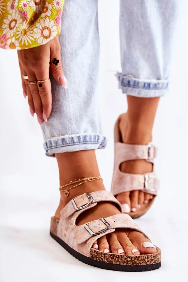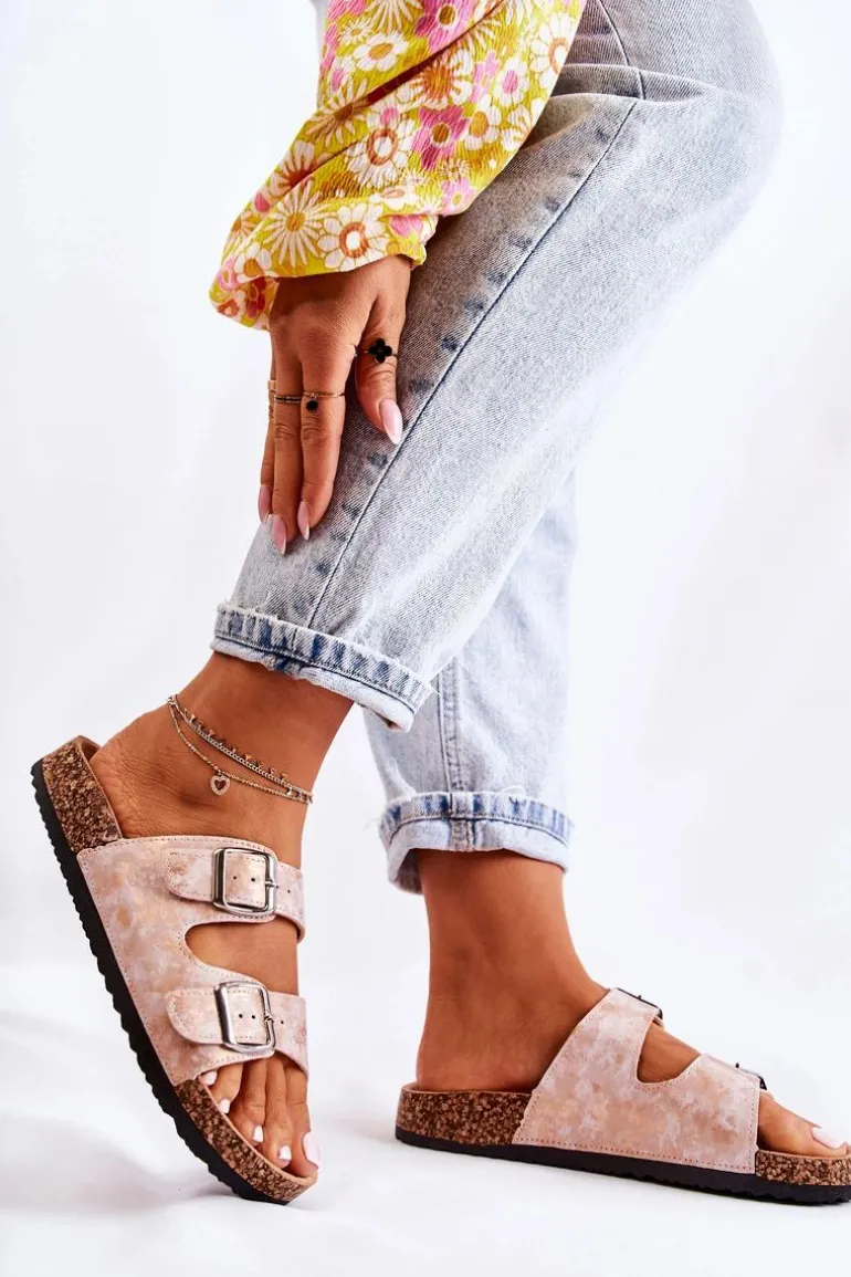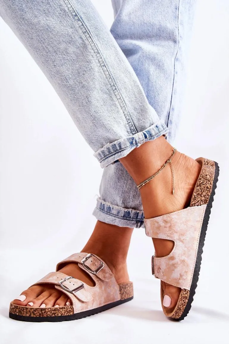 Damskie Klapki Na Korku Z Klamrami Różowe Złoto Vivio