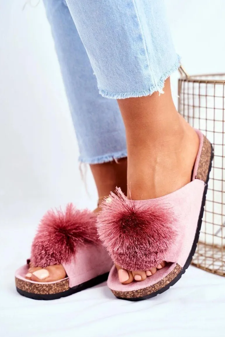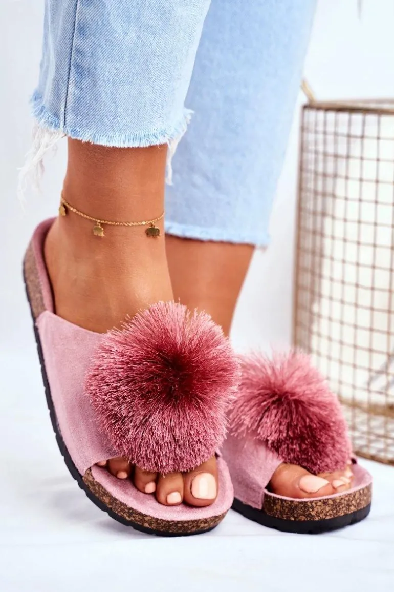 Damskie Klapki Na Korku z Pomponem Różowe Galaxo