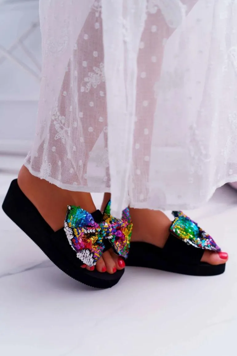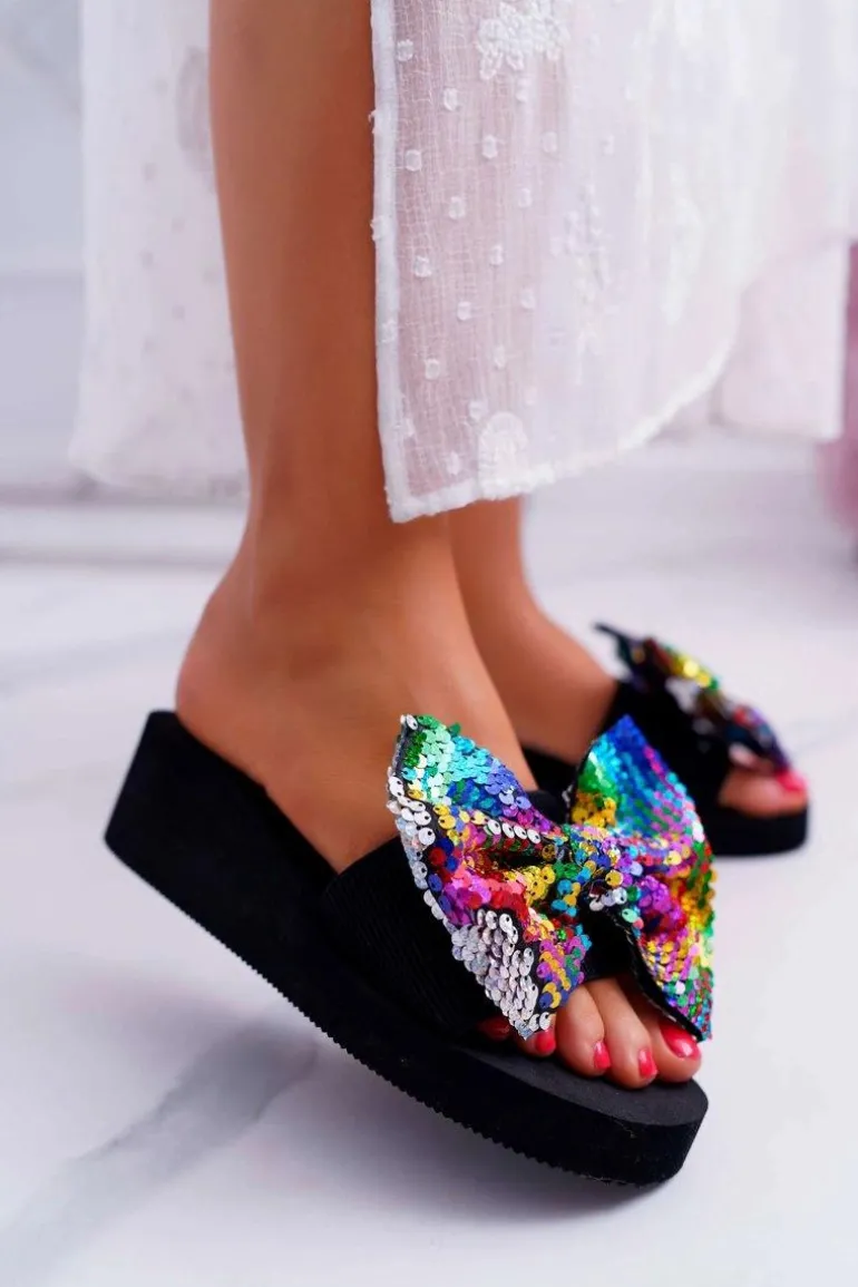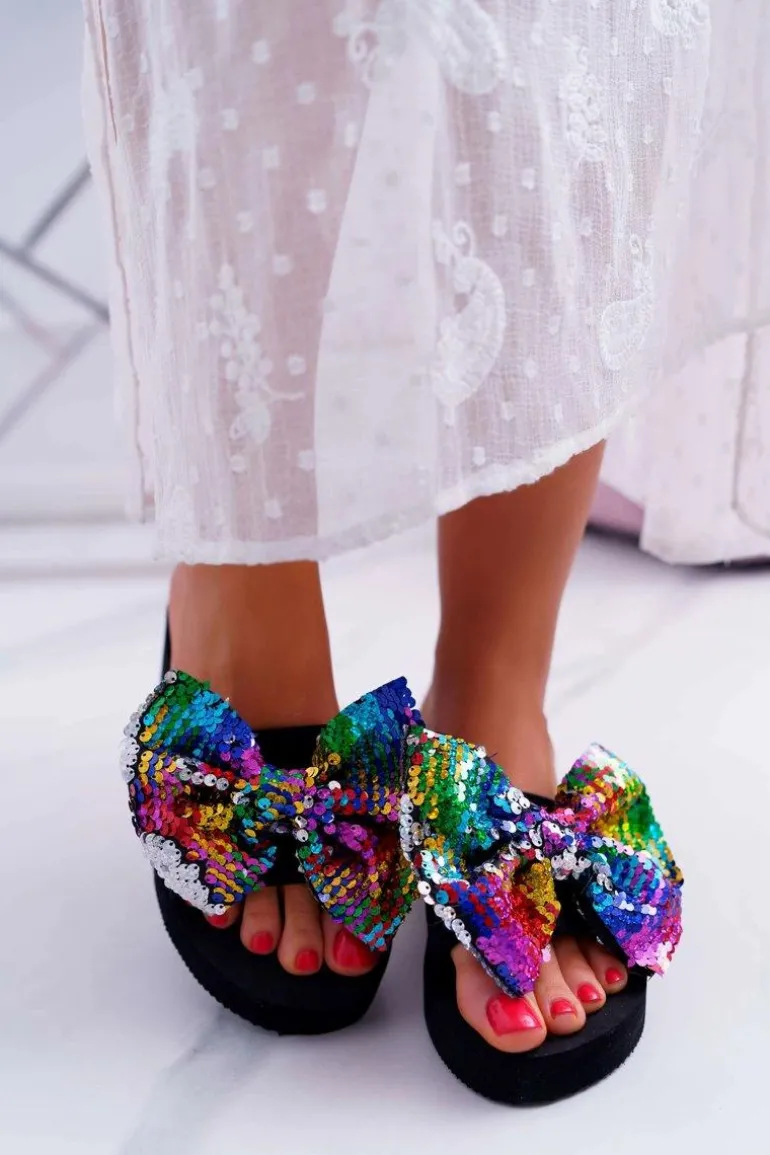 Damskie Klapki Na Koturnie Piankowe Kokarda Opalizujące Cekiny Meow