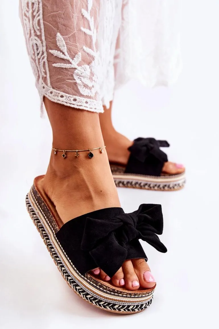 Klasyczne damskie klapki zostały osadzone na masywnej, korkowej platformie z wieloma zdobieniami. Wykonane z wierzchu z eko zamszu. Na przodzie znajduje się ozdoba w postaci kokardy. Profilowana wkładka jest wykonana z przyjemnego w dotyku eko zamszu. Podeszwa wykonana z tworzywa sztucznego. Model klasyczny, wsuwany. Te klapki to idealny model na lato! Przy wyborze rozmiaru prosimy sugerować się tabelą rozmiarów.