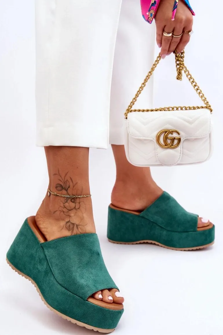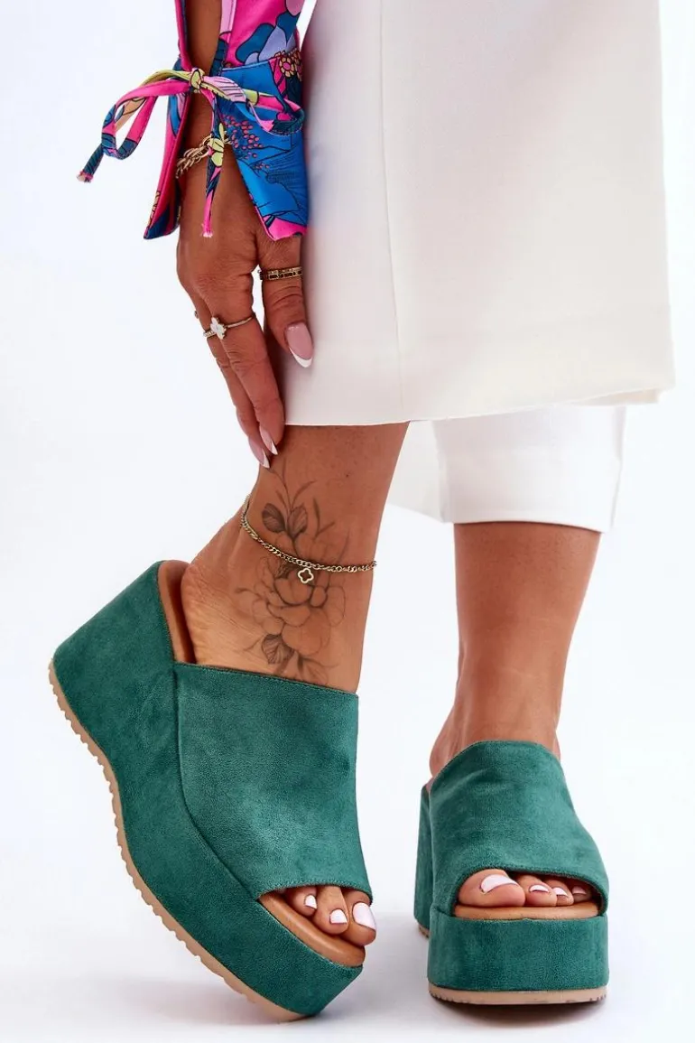 Wyjątkowe, damskie klapki zostały osadzone na masywnej platformie i koturnie. Wykonane z wierzchu z miłego w dotyku eko zamszu. Miękka wkładka została wykonana z eko skóry. Klapki posiadają odkryty nosek. Model ten posiada podeszwę z tworzywa sztucznego. Te klapki to świetny wybór na letnie, upalne dni! Przy wyborze rozmiaru prosimy sugerować się tabelą rozmiarów.