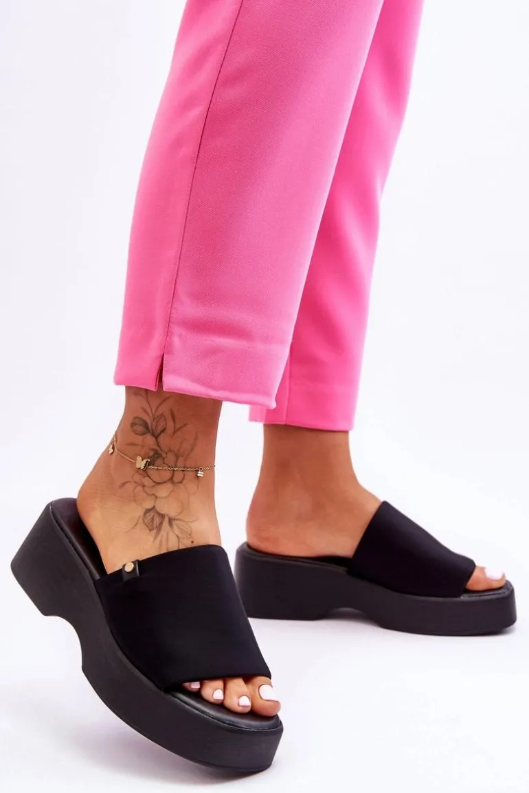 Klasyczne klapki osadzone na masywnej platformie i płaskim obcasie. Wykonane z wierzchu z materiału tekstylnego. Posiadają delikatne zdobienie. Miękka wkładka zapewni wygodne użytkowanie obuwia nawet przez cały dzień. Klasyczny fason z odkrytym, kwadratowym noskiem. Świetnie sprawdzą się do wielu stylizacji! Przy wyborze rozmiaru prosimy kierować się tabelą rozmiarów.