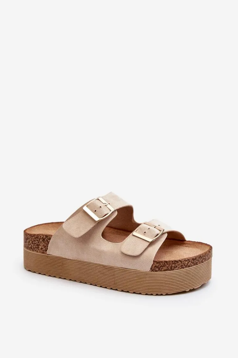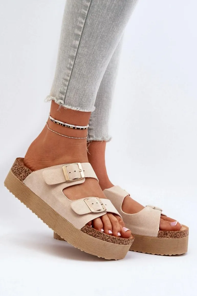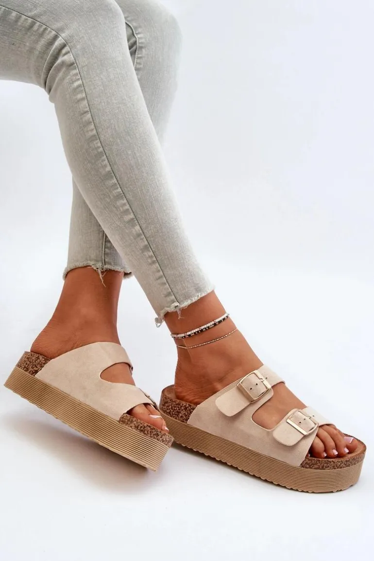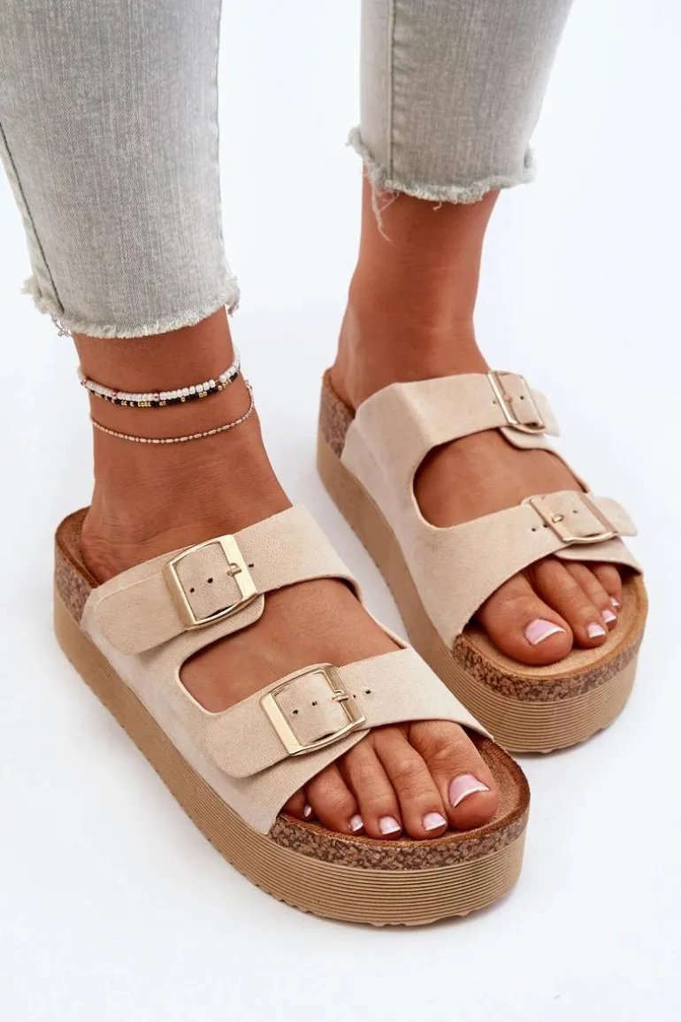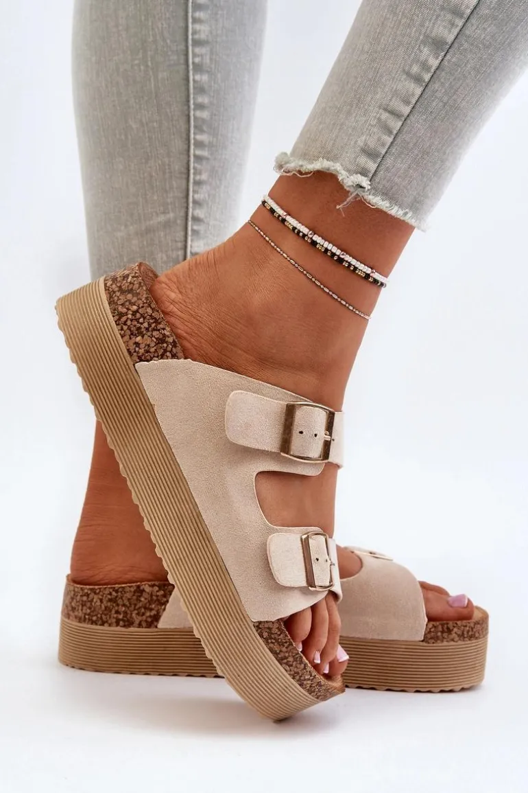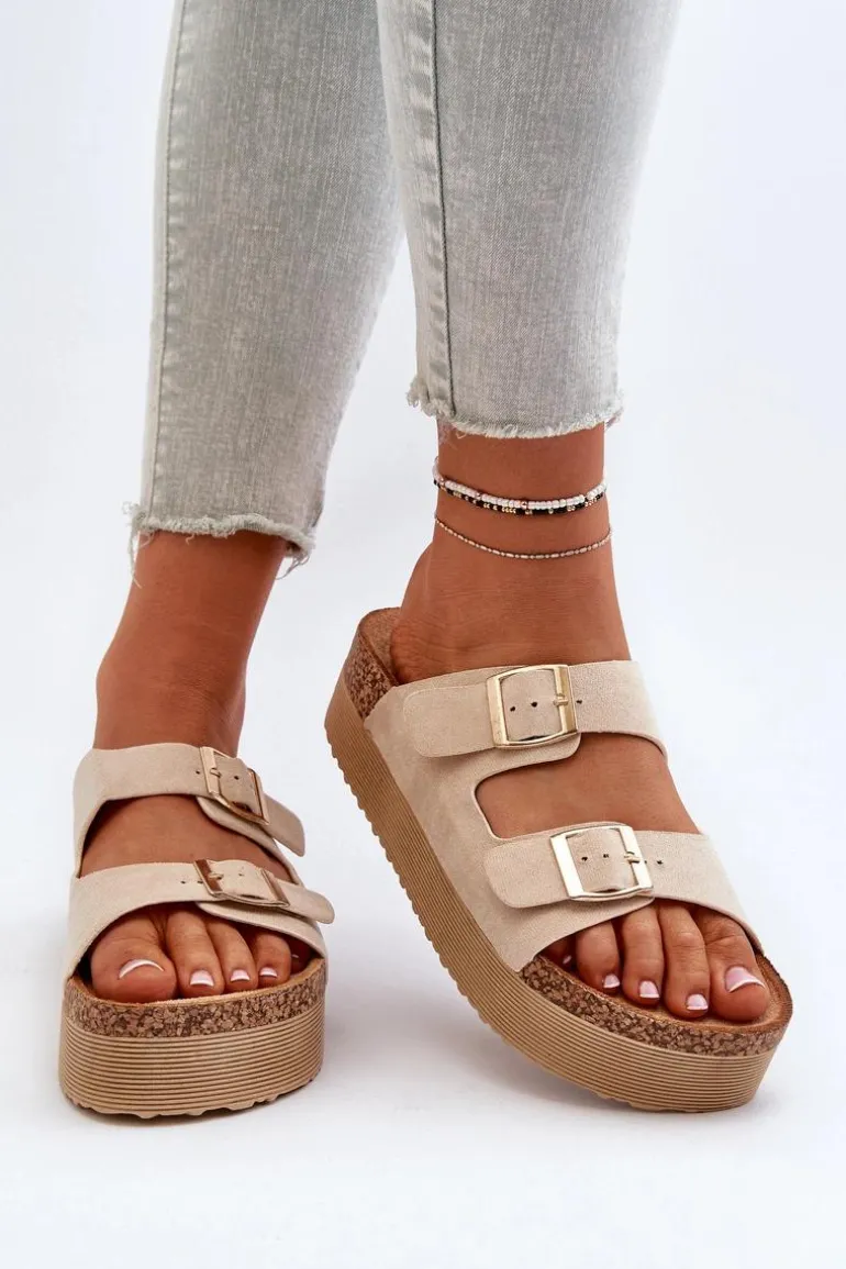 Damskie Klapki Na Platformie Z Klamrami Beżowe Lolpey