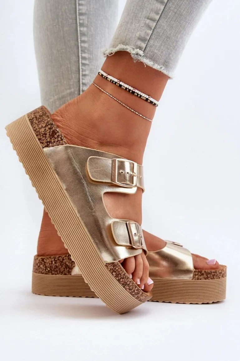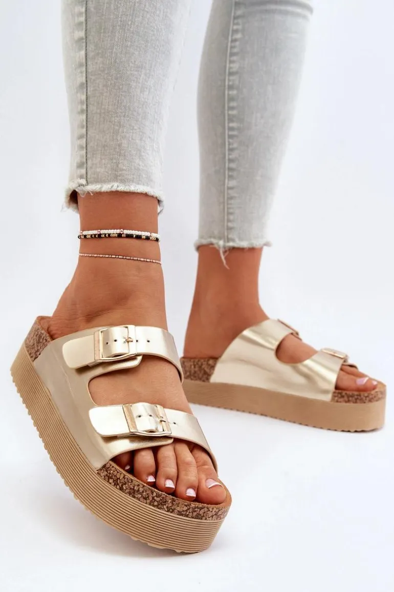 Damskie Klapki Na Platformie Z Klamrami Złote Lolpey