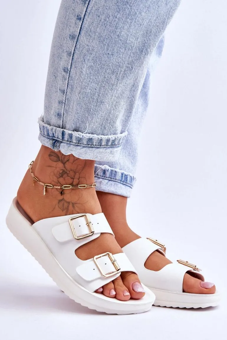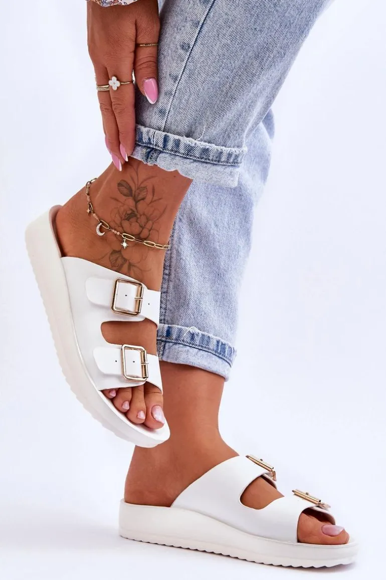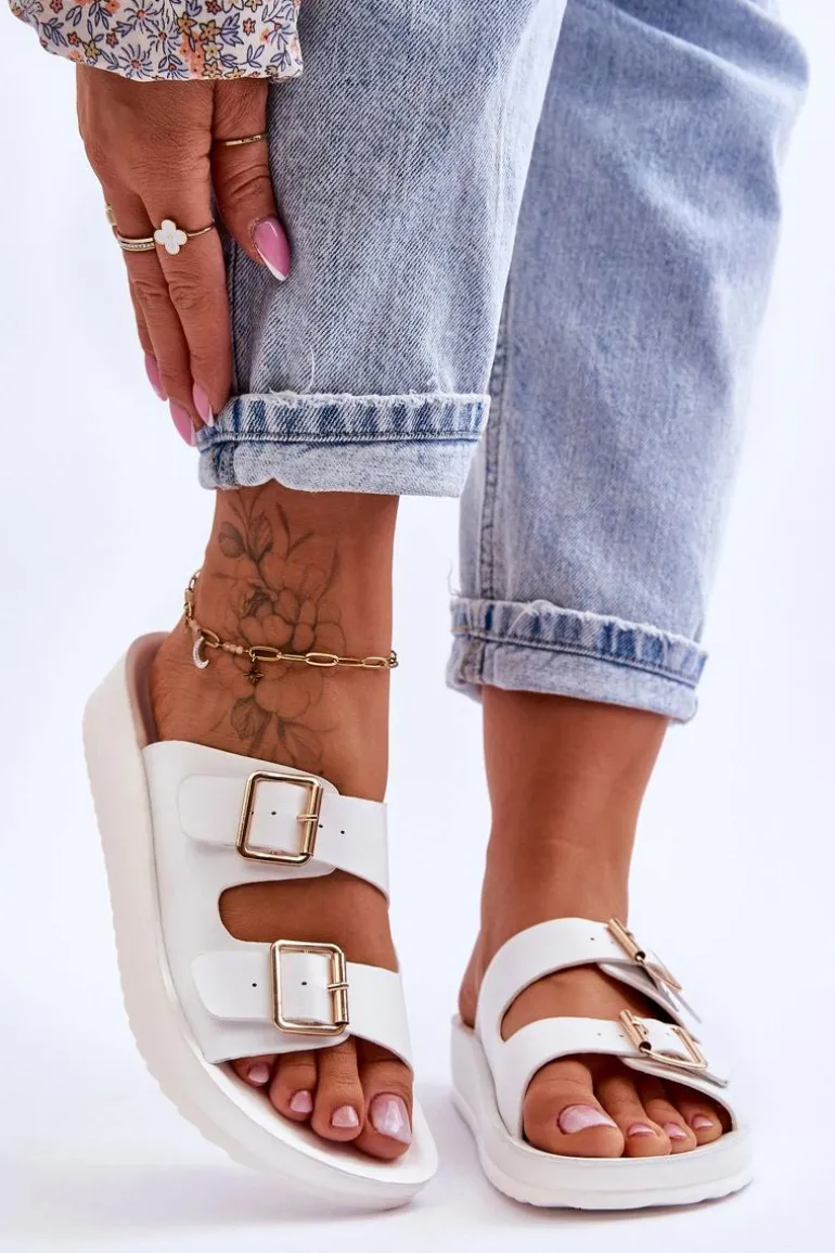 Klasyczne, damskie buty zostały wykonane z eko skóry. Posiadają ozdobną klamrę z regulowanymi paskami. Model ten został osadzony na platformie z tworzywa sztucznego. Idealne obuwie na letni sezon. Klapki te są niezwykle przewiewne i wygodne. Koniecznie powinnaś je mieć! Przy wyborze rozmiaru prosimy sugerować się tabelą rozmiarów.