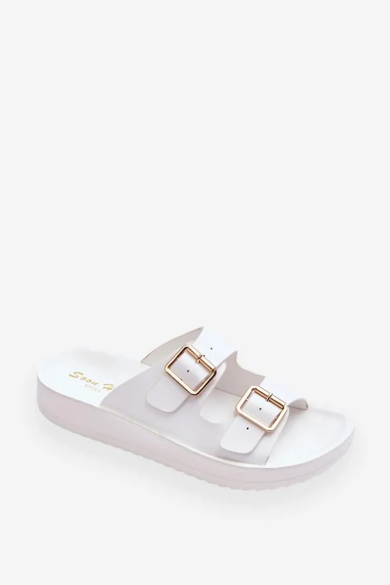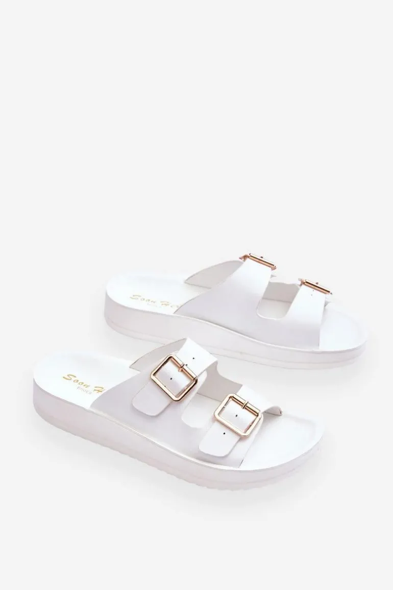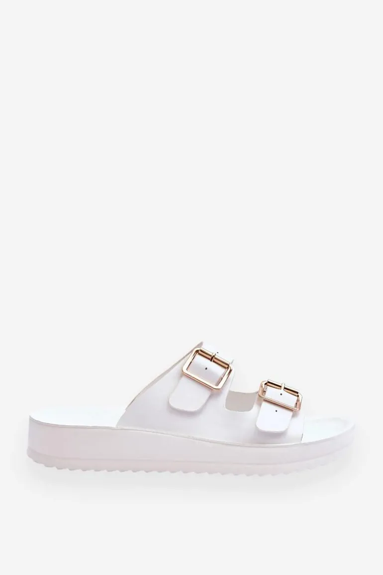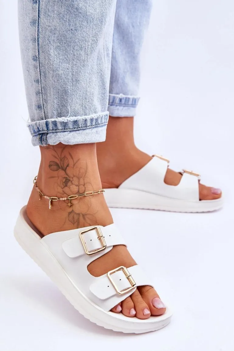 Klasyczne, damskie buty zostały wykonane z eko skóry. Posiadają ozdobną klamrę z regulowanymi paskami. Model ten został osadzony na platformie z tworzywa sztucznego. Idealne obuwie na letni sezon. Klapki te są niezwykle przewiewne i wygodne. Koniecznie powinnaś je mieć! Przy wyborze rozmiaru prosimy sugerować się tabelą rozmiarów.