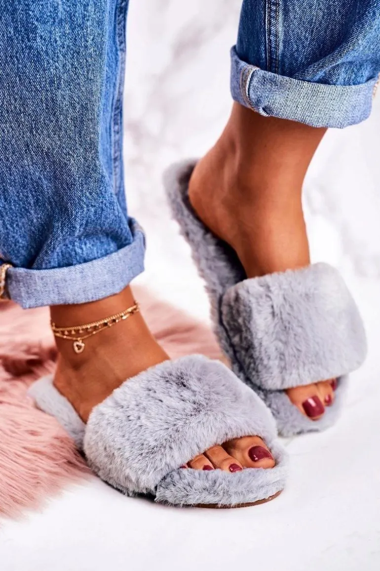 Damskie Klapki Papcie Futrzane Szare Cold Days