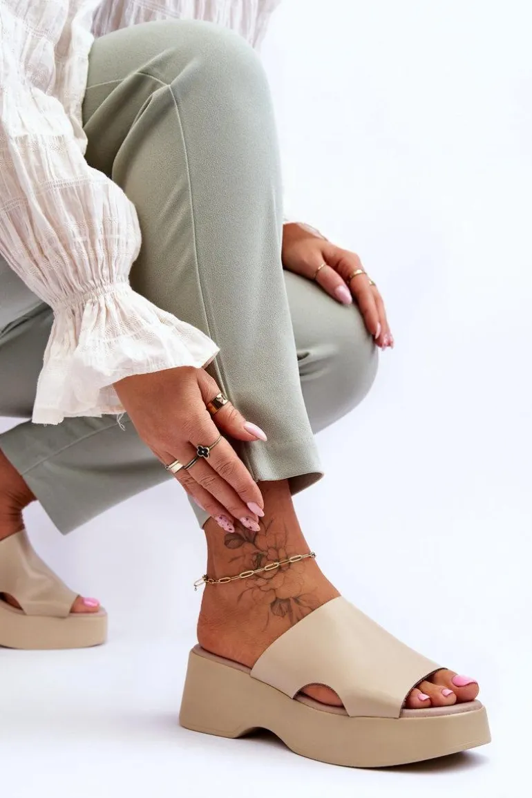Damskie, klasyczne klapki zostały wykonane z naturalnej skóry z wycięciami. Osadzone na płaskim obcasie z ozdobioną podeszwą. Model ten z pewnością przypadnie do gustu każdej kobiecie ceniącej sobie styl oraz wygodę. Miękka, skórzana wkładka pozwoli na komfortowe użytkowanie obuwia nawet przez cały dzień. Przy wyborze rozmiaru prosimy sugerować się tabelą rozmiarów.