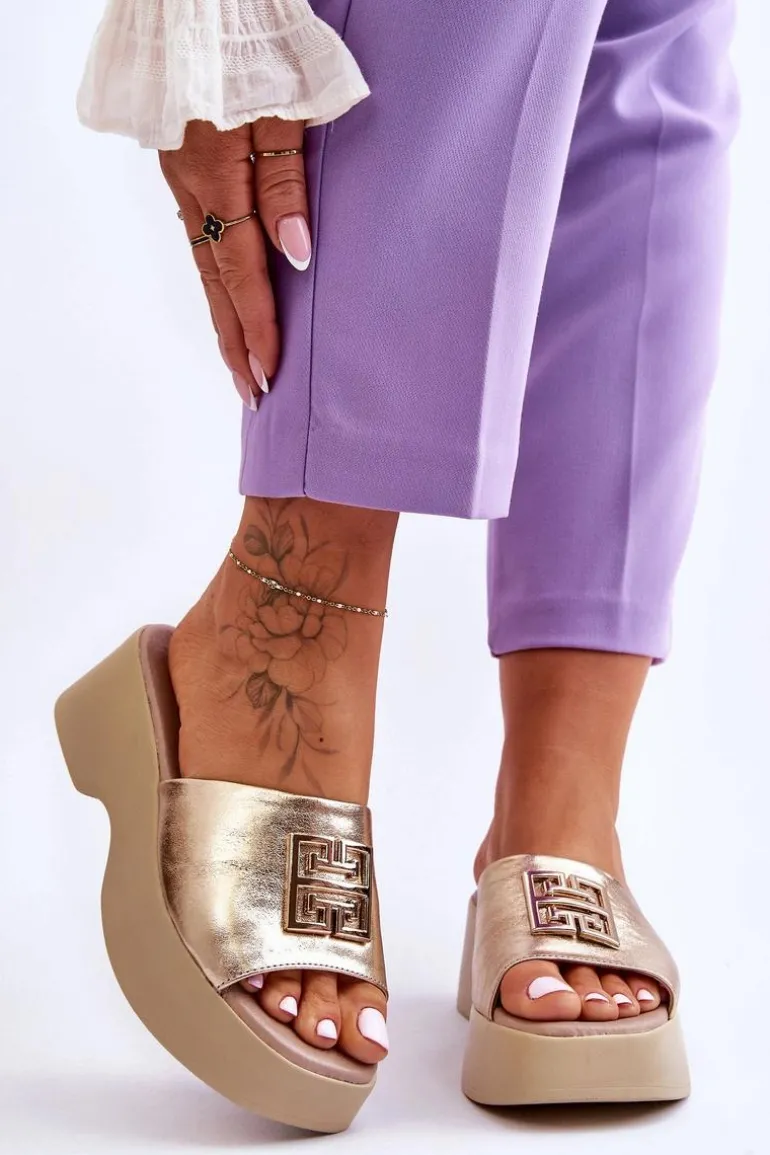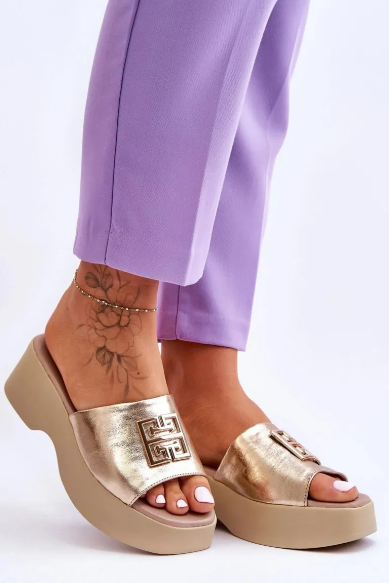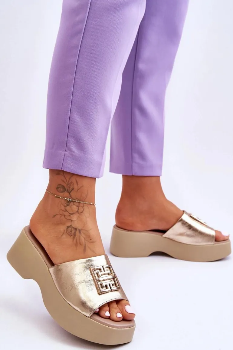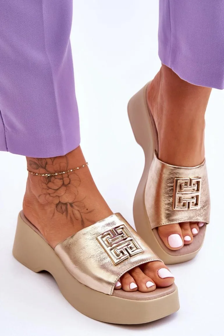Damskie klapki zostały osadzone na platformie i płaskim obcasie. Wykonane z naturalnej skóry. Dodatkowo posiadają na modną ozdobę. Model ten z pewnością przypadnie do gustu każdej kobiecie ceniącej sobie styl oraz wygodę. Miękka, skórzana wkładka zapewni wygodę podczas użytkowania. Przy wyborze rozmiaru prosimy sugerować się tabelą rozmiarów.