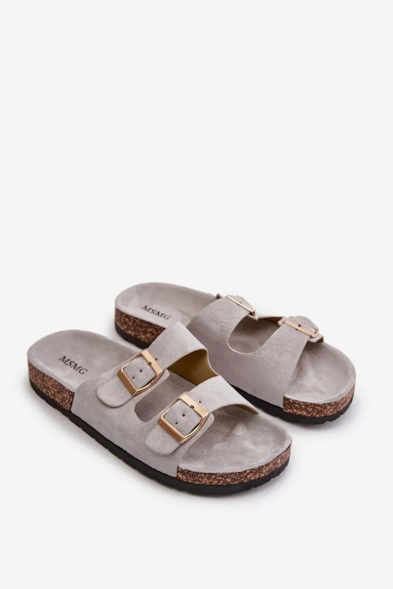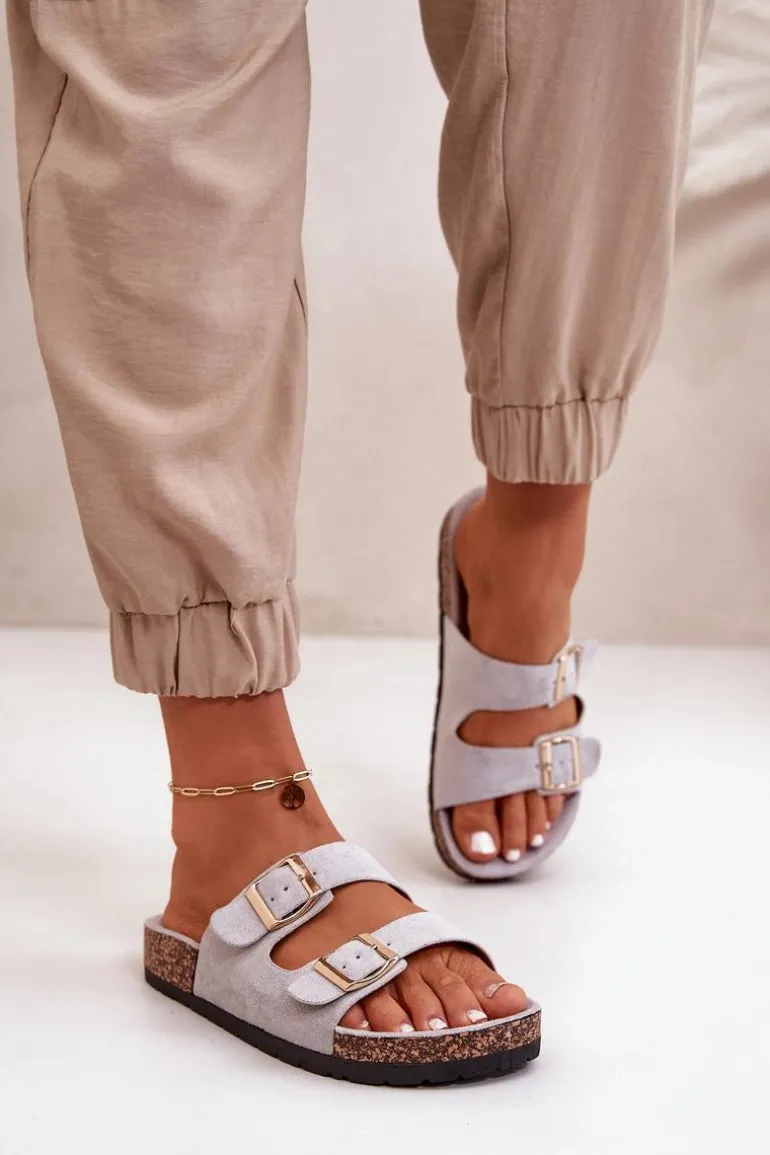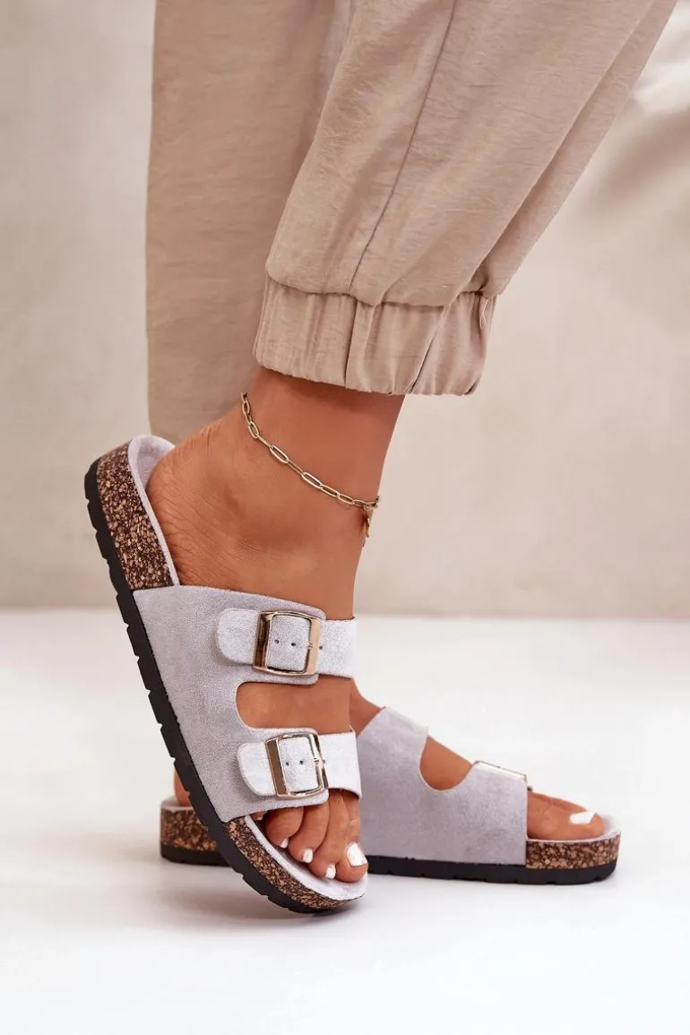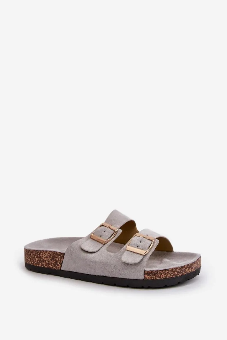 Klapki te posiadają dwa szerokie paski zapinane na sprzączkę, które można regulować. Idealne na letnie spacery oraz codzienne wyjścia na zakupy. Profilowana, wykonana z eko zamszu wkładka zapewni wygodę oraz komfort. Podeszwa została wykonana z tworzywa sztucznego. Klapki te sprawiają, że Twoje stopy będą wypoczęte i zrelaksowane. Przy wyborze rozmiaru prosimy sugerować się tabelą rozmiarów.