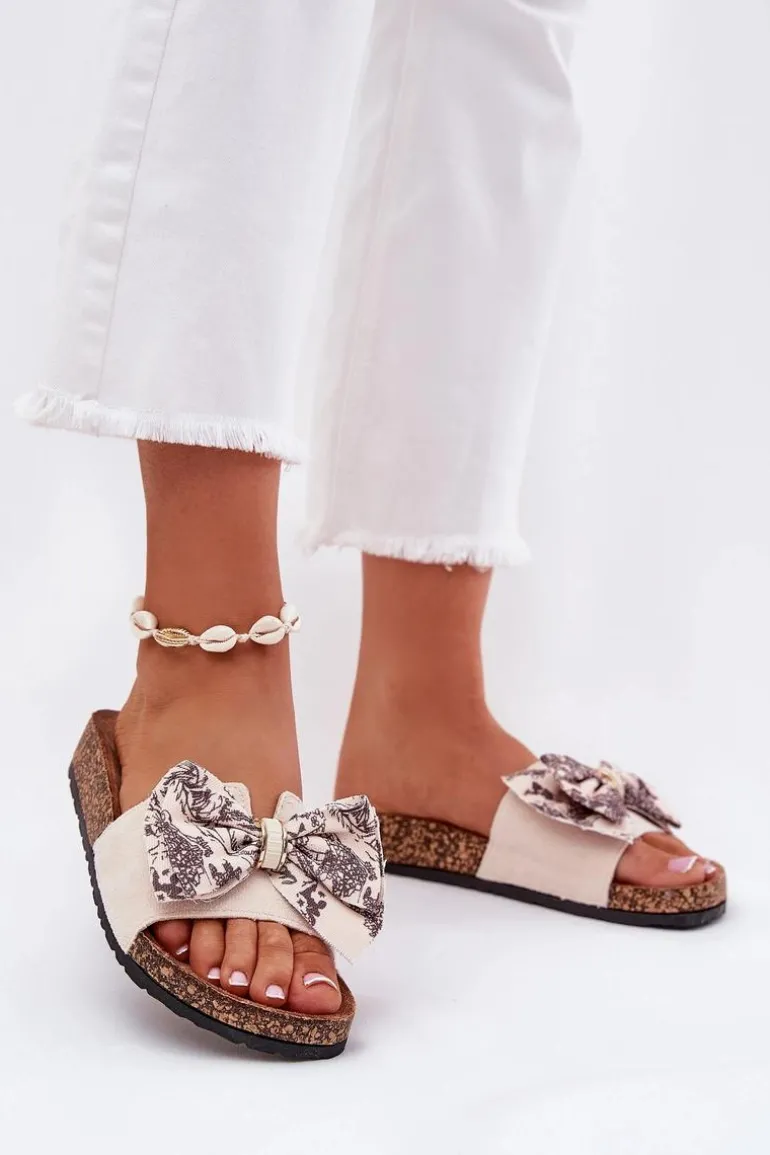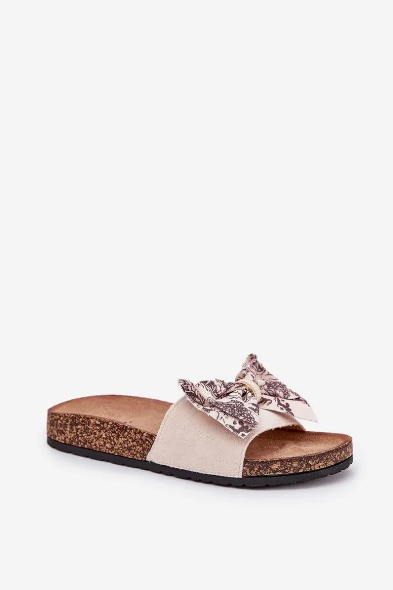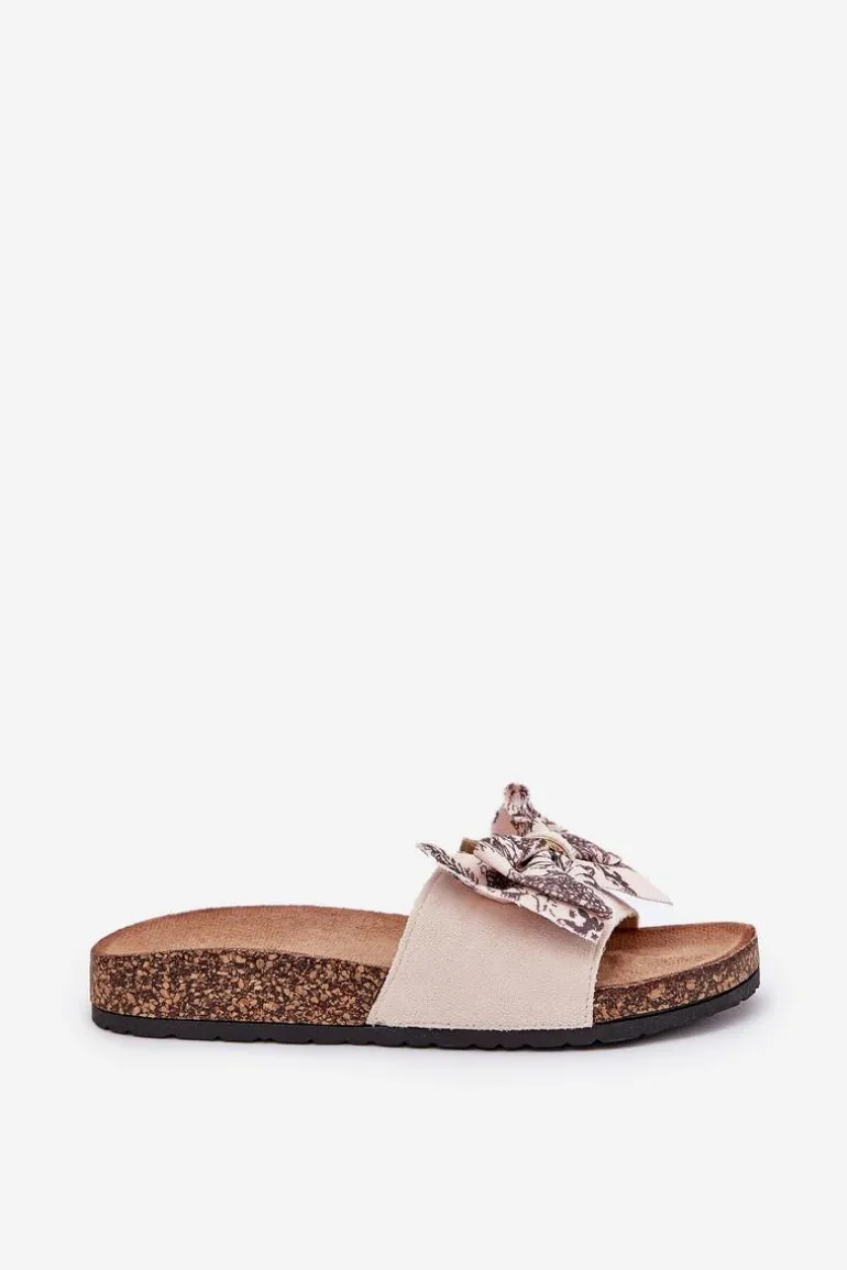 Stylowe klapki z korkową podeszwą charakteryzują się profilowaną wkładką. Wykonane z eko zamszu i materiału tekstylnego. Przód zdobi kokarda. Klapki są uniwersalne i doskonale nadają się do codziennych aktywności, pracy czy zakupów. To idealny wybór na letnie dni! Przy wyborze rozmiaru prosimy sugerować się tabelą rozmiarów.