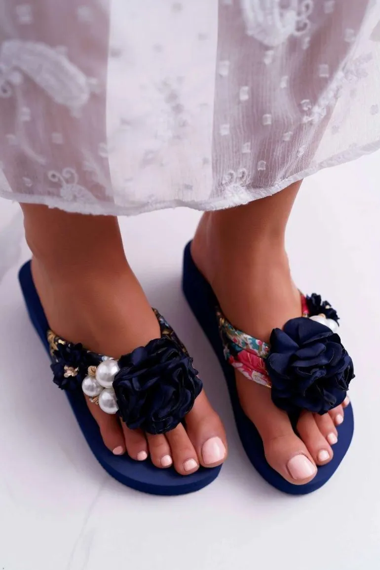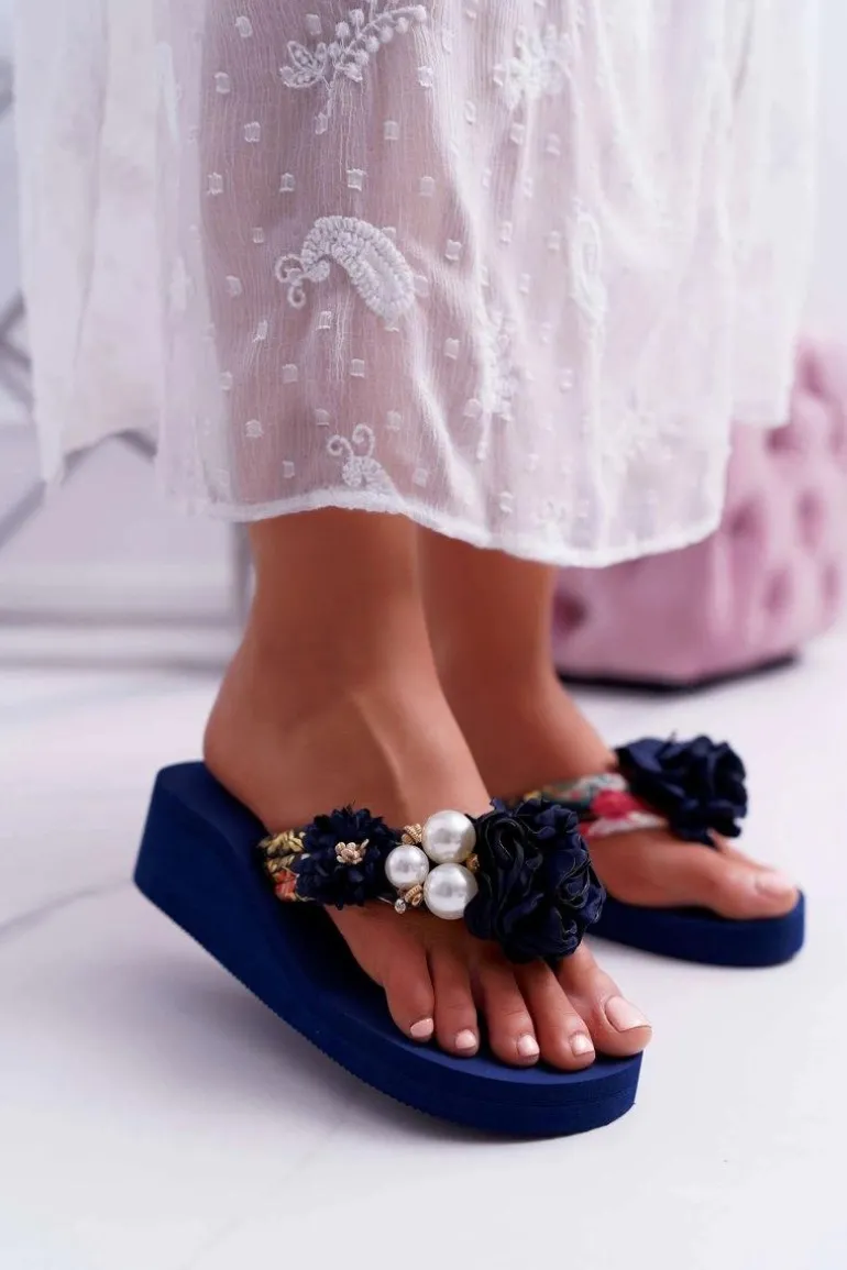 Damskie Klapki Z Kwiatem Japonki Na Koturnie Granatowe Sharme