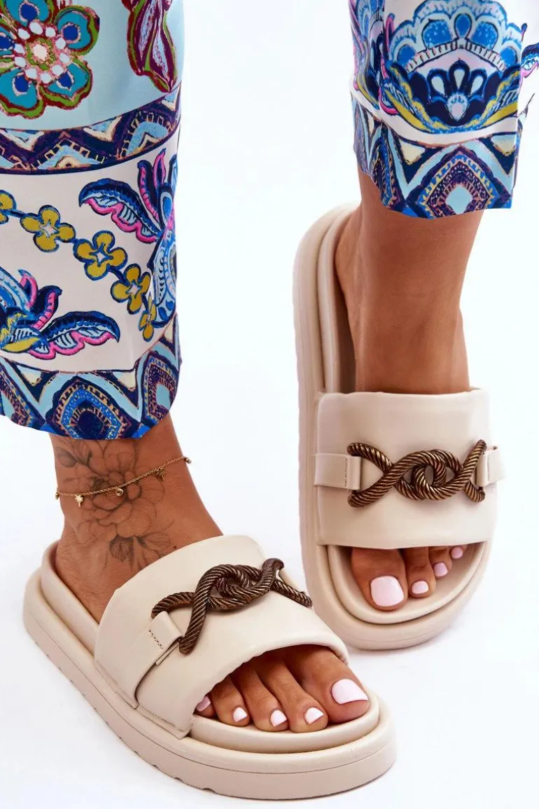 Klasyczne, damskie klapki zostały wykonane z eko skóry. Model ten posiada na przodzie ozdobę w postaci imitacji plecionego sznura. Klapki osadzono na delikatnej platformie. Wkładka jest profilowana i wygodna w użytkowaniu. Nosek w tym obuwiu jest odkryty i lekko zaokrąglony. Ten model powinien znaleźć się właśnie w Twojej garderobie! Przy wyborze rozmiaru prosimy sugerować się tabelą rozmiarów.