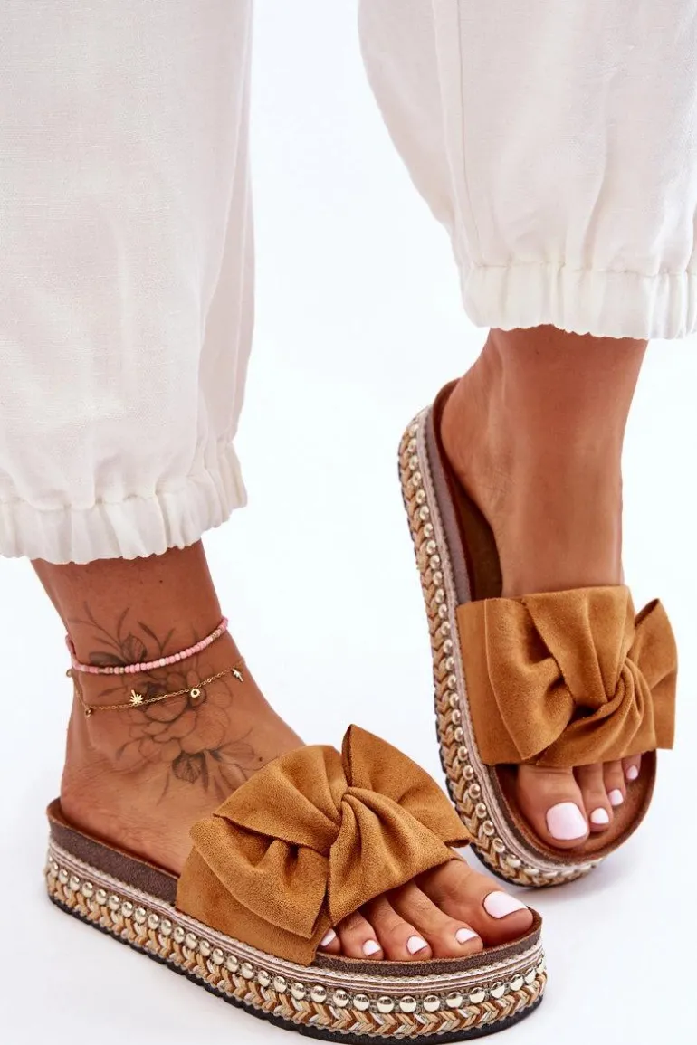 Klasyczne, damskie klapki zostały osadzone na masywnej platformie ze zdobieniami w postaci sznureczków oraz ćwieków. Wykonane z eko zamszu. Na przodzie znajduje się ozdoba w postaci kokardy. Profilowana wkładka jest wykonana z przyjemnego w dotyku eko zamszu. Te klapki to idealny model na lato! Przy wyborze rozmiaru prosimy sugerować się tabelą rozmiarów.