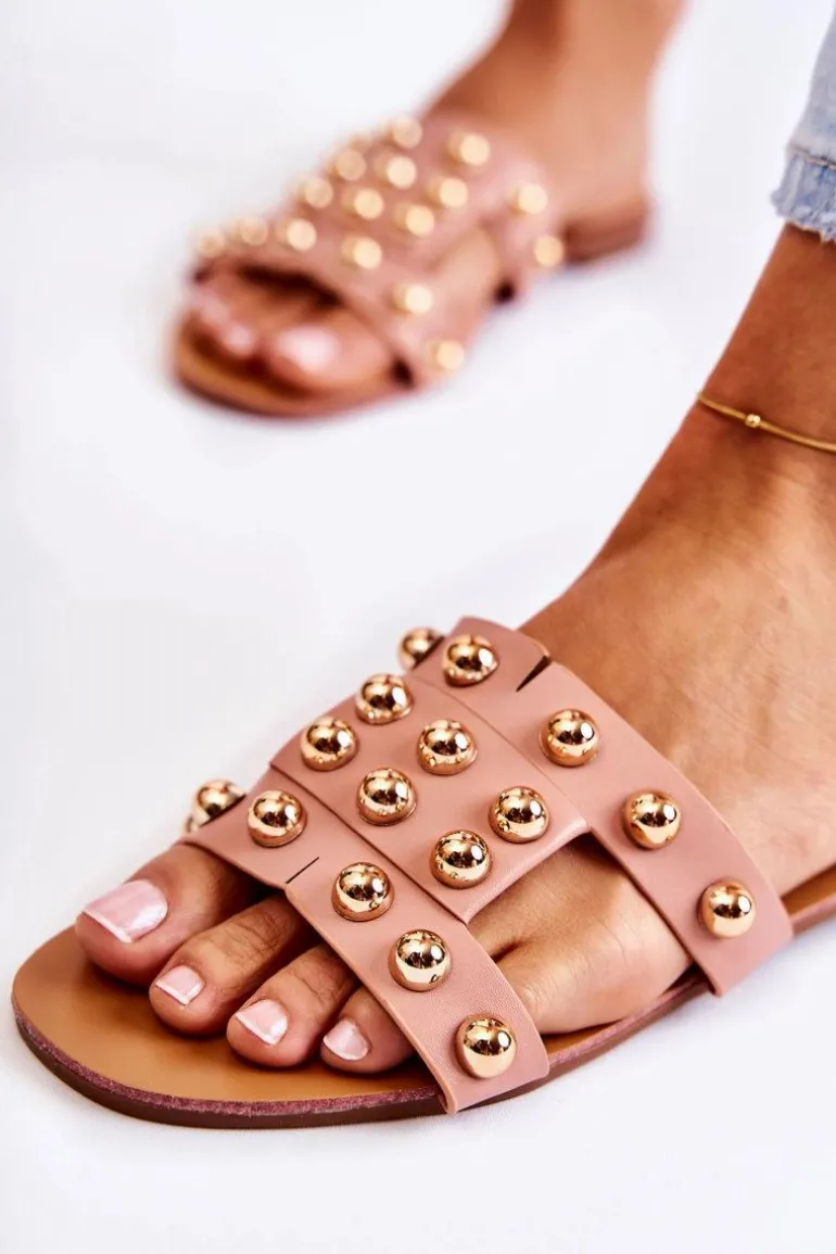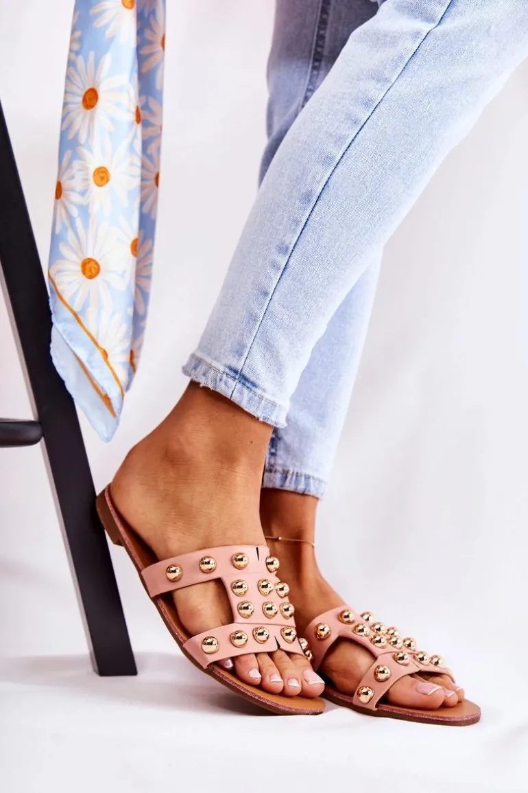 Klasyczne klapki damskie wykonane z eko skóry posiadają delikatne nacięcia na paskach. Zostały ozdobione lustrzanymi elementami w postaci półkul. Miękka wkładka wykonana z eko skóry. Buty zostały osadzone na płaskim obcasie. Podeszwa wykonana z gumowego tworzywa, która jest dodatkowo antypoślizgowa. Świetny model, który sprawdzi się podczas upalnych dni! Przy wyborze rozmiaru prosimy sugerować się tabelą rozmiarów.