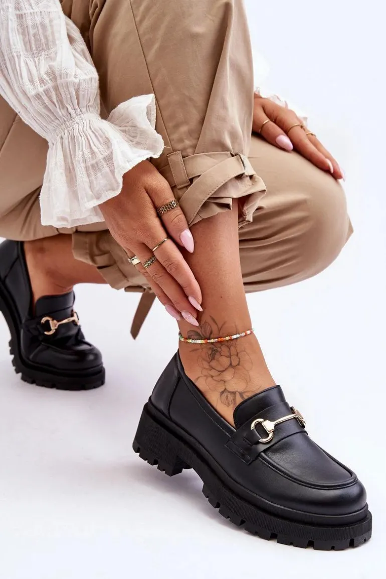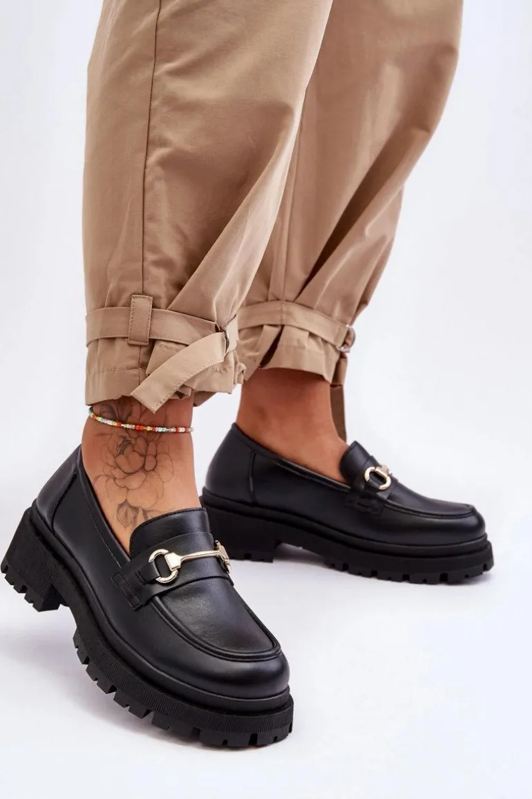 Te cudowne, damskie mokasyny osadzono na masywnej platformie i płaskim obcasie. Świetnie wpasują się w wiele stylizacji wiosenno-jesiennych. Mokasyny zostały wykonane z eko skóry. Posiadają delikatnie usztywniany zapiętek oraz miękką wkładkę. Na pasku z przodu znajduje się ozdoba z tworzywa sztucznego. Przy wyborze rozmiaru prosimy sugerować się tabelą rozmiarów.
