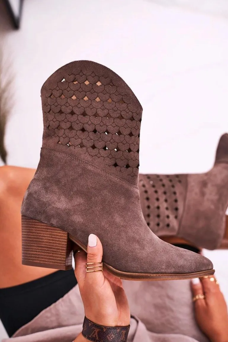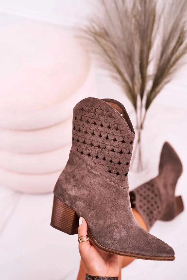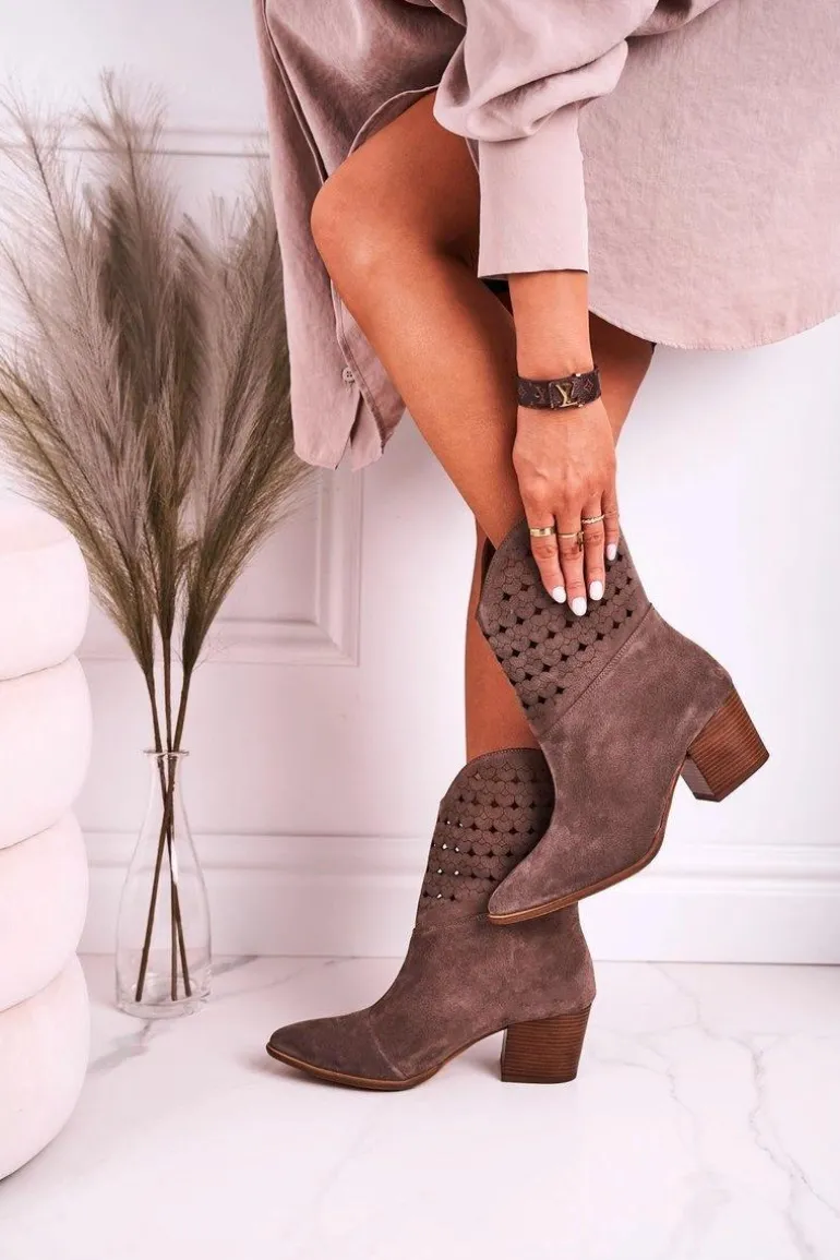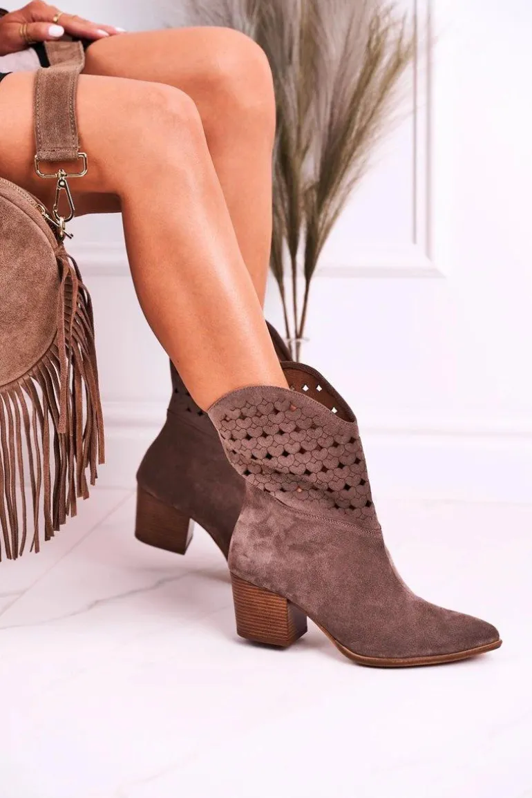 Damskie Kowbojskie Botki Na Słupku Zamszowe Brązowe Emily