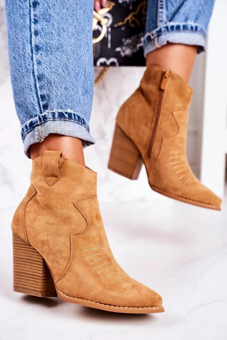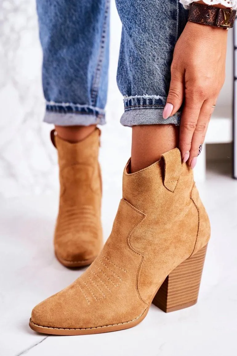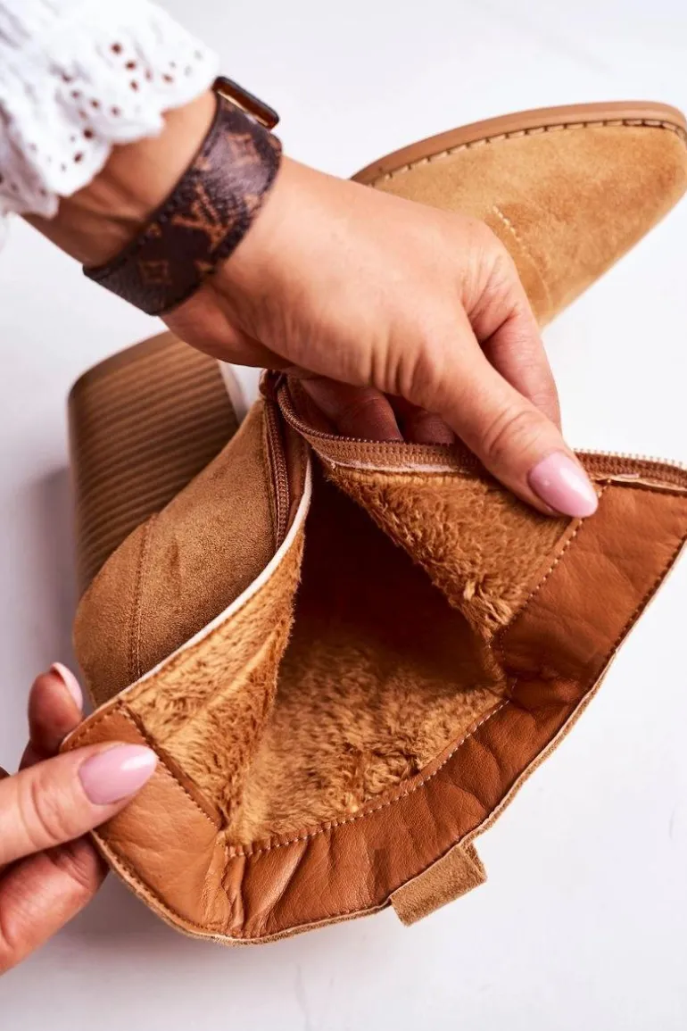 Damskie Kowbojskie Ocieplane Botki Na Słupku Karmelowe Margaret