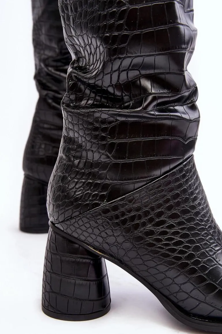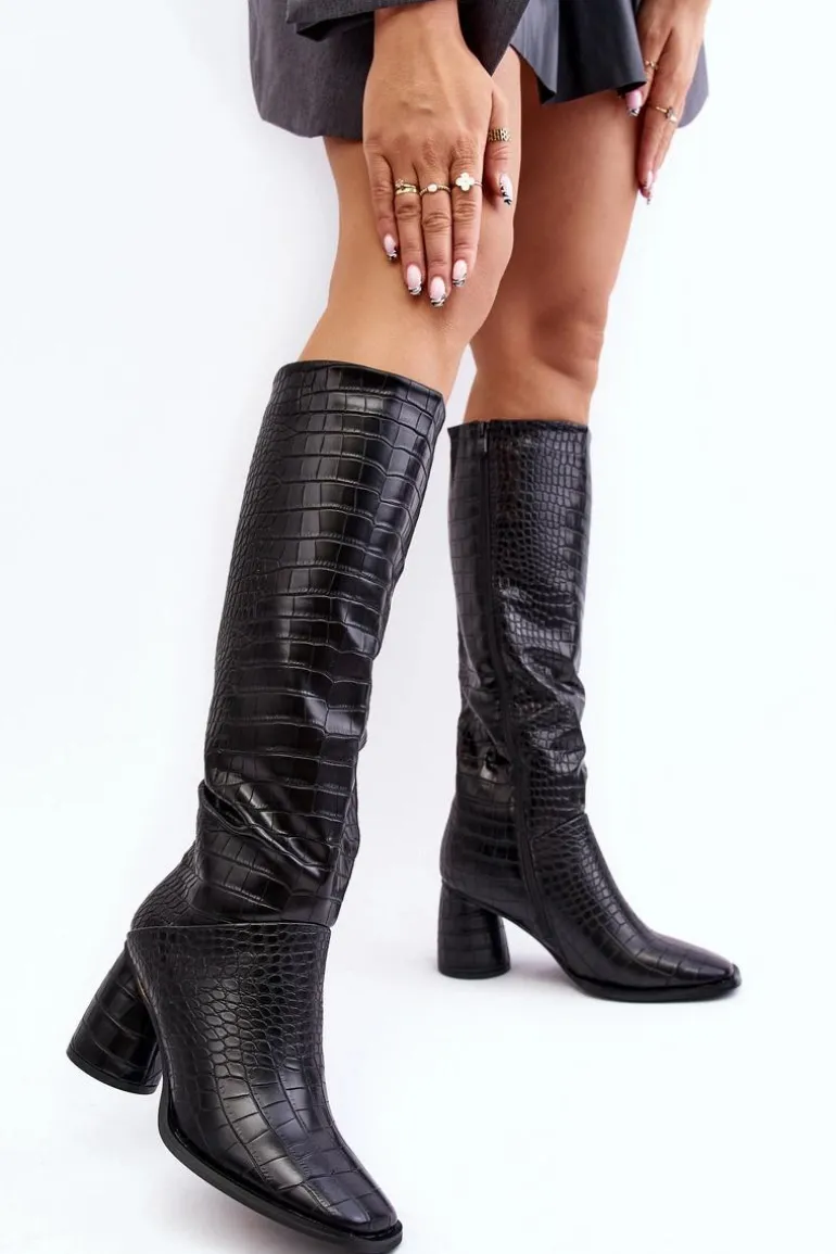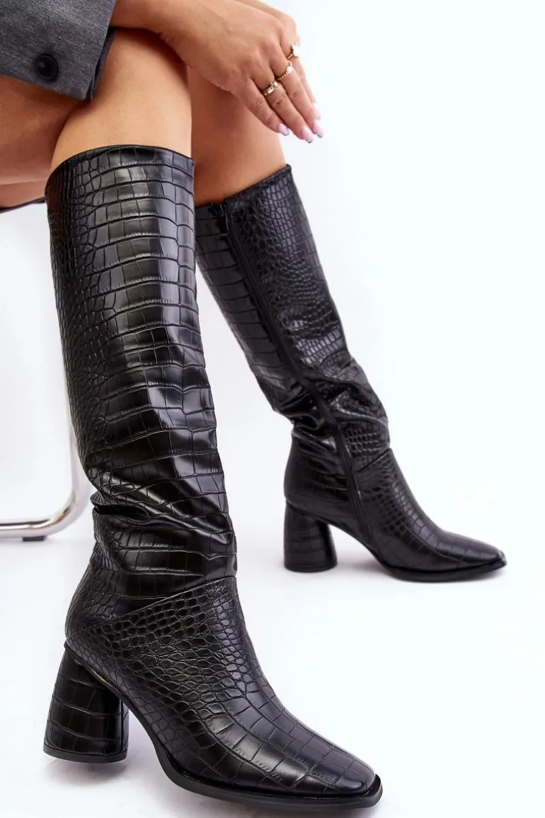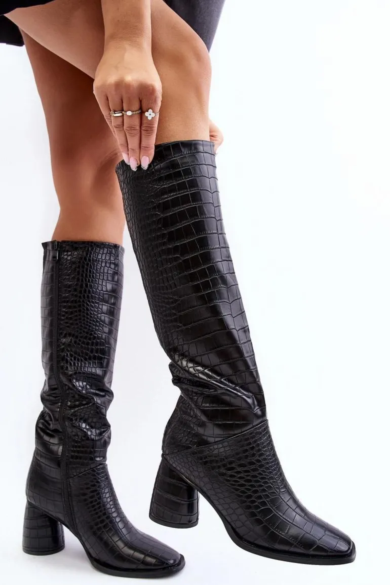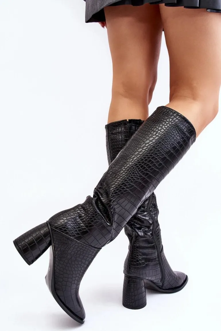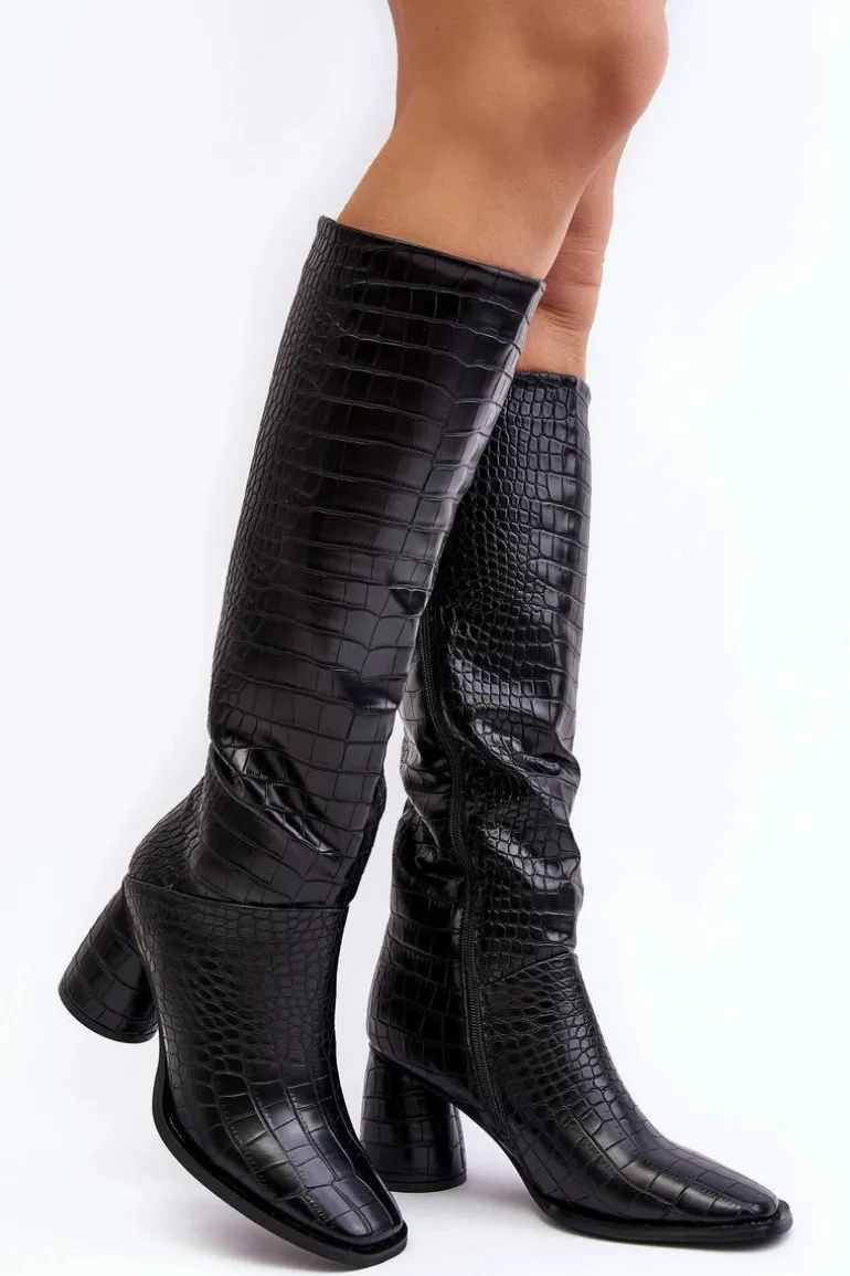 Kozaki damskie z cholewką do kolana w wężowy wzór. Osadzone na obcasie słupku. Wykonane z eko skóry. Zapinane na suwak z boku. Środek ocieplony kocem obuwniczym. Noski w kwadrat. Wykorzystasz je w wielu stylizacjach! Przy wyborze rozmiaru prosimy sugerować się tabelą rozmiarów.