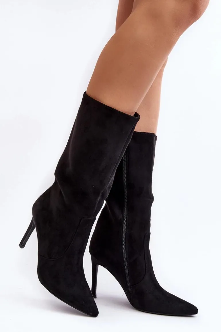 Kozaki damskie wykonane z eko zamszu. Osadzone na zgrabnej szpilce, co dodaje im kobiecego uroku, a jednocześnie gwarantuje elegancję. Ocieplenie w postaci koca obuwniczego zapewnia ciepło i komfort w chłodniejsze dni. Delikatnie szpiczaste noski optycznie wysmuklają nogi, dodając subtelnego wdzięku. Suwak na całej długości cholewki ułatwia zarówno zakładanie, jak i zdejmowanie butów. Ten wyjątkowy model zasługuje na swoje miejsce w Twojej garderobie! Przy wyborze rozmiaru prosimy sugerować się tabelą rozmiarów.