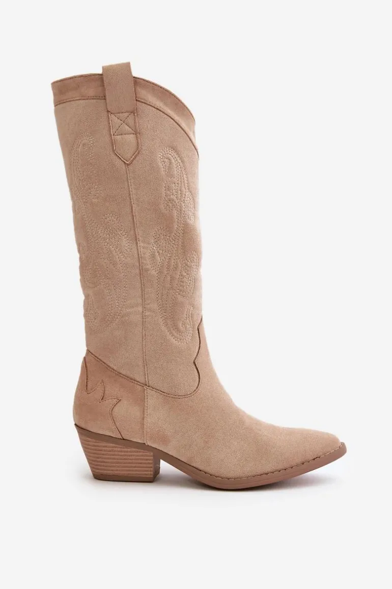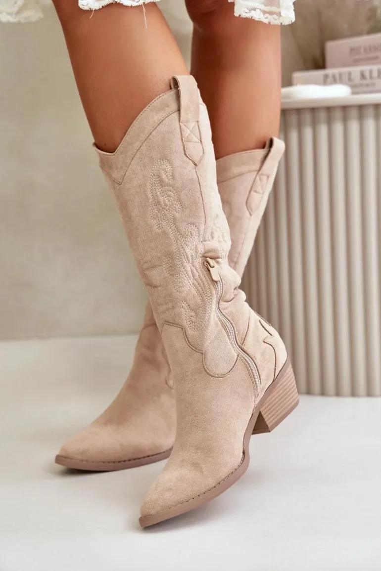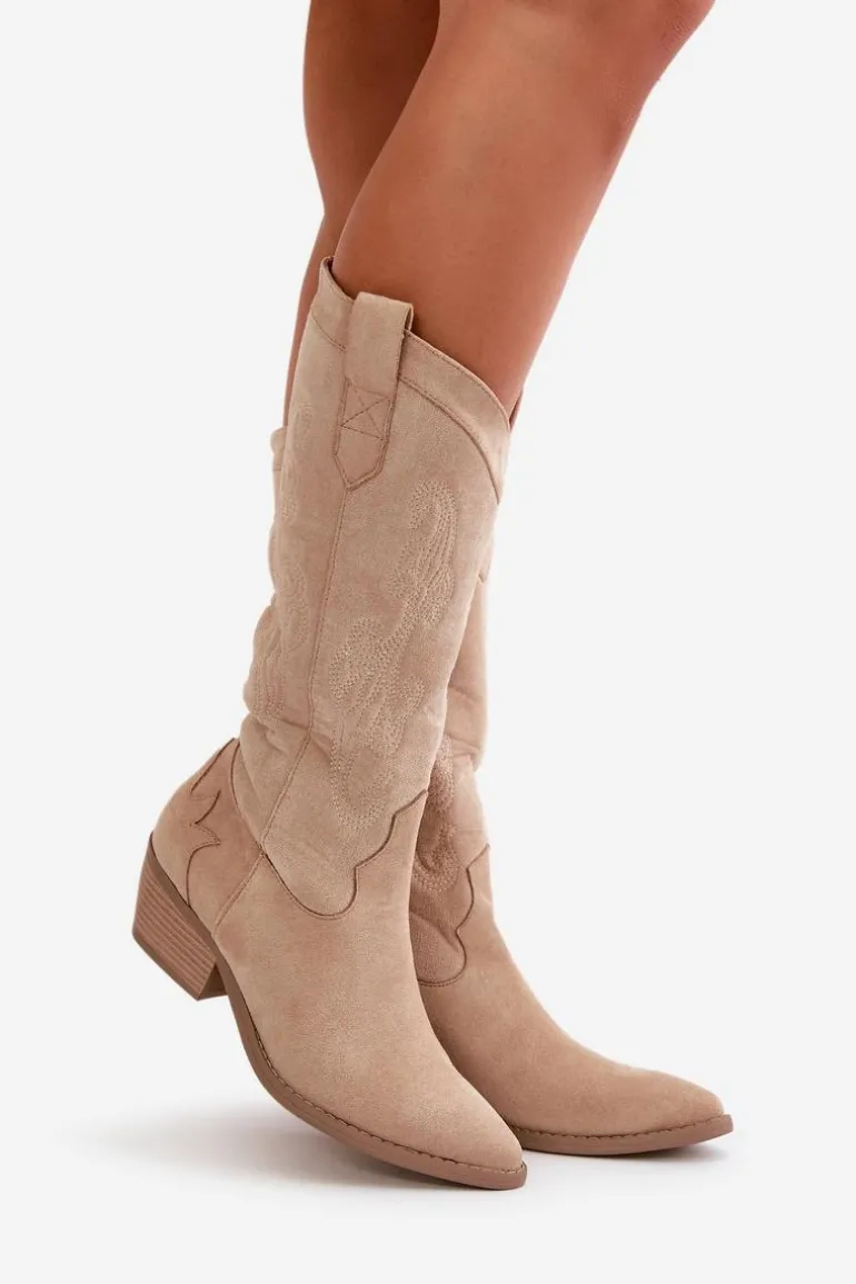 Damskie kozaki z eko zamszu to stylowa propozycja dla każdej kobiety. Osadzone na niskim obcasie i zakończone noskami w szpic, dodają elegancji każdej stylizacji. Model wsuwany z dodatkowym zapięciem na zamek. Kozaki kowbojki świetnie uzupełnią różnorodne zestawy modowe. Nie może ich zabraknąć w Twojej garderobie! Przy wyborze rozmiaru prosimy sugerować się tabelą rozmiarów.