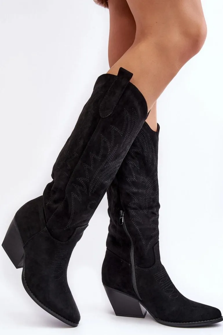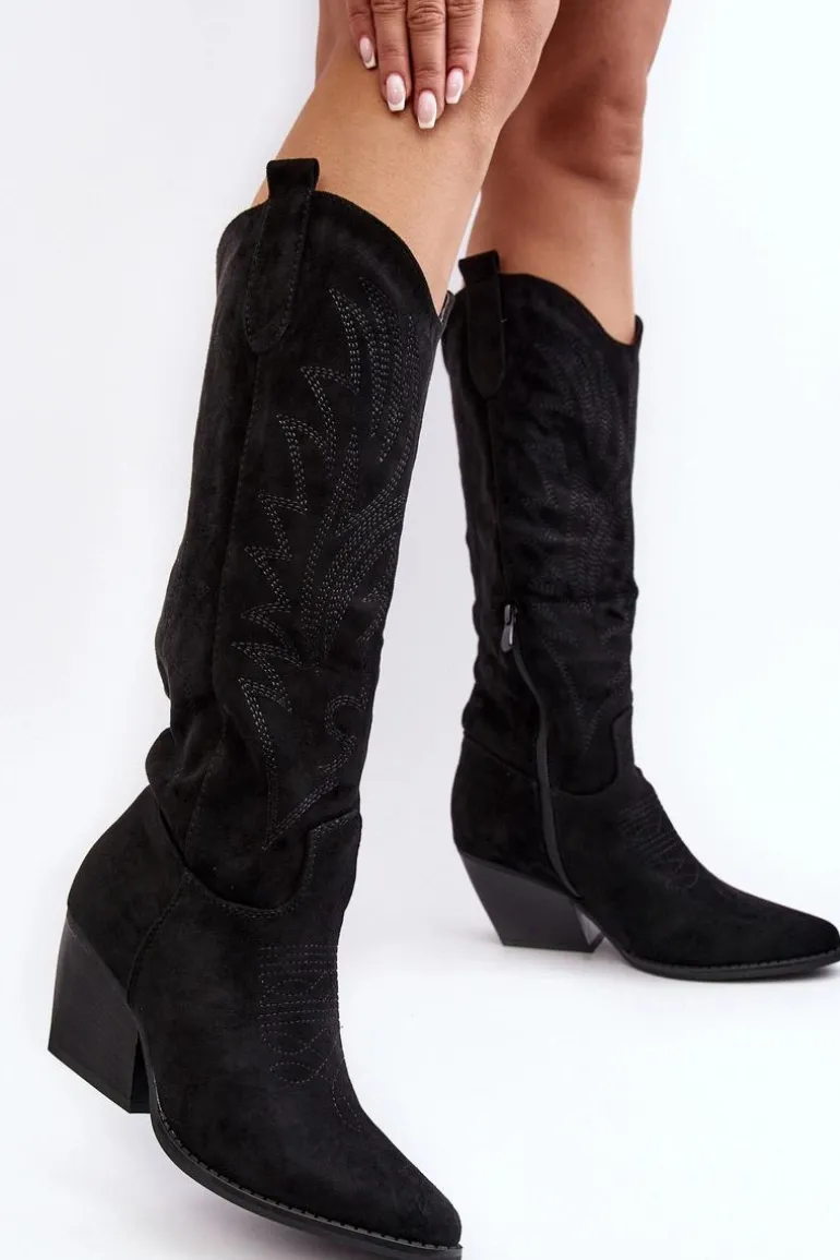 Damskie kozaki przed kolano wykonane z eko zamszu. Osadzone na obcasie w postaci niskiego słupka. Noski w szpic optycznie wysmuklą nogi. Zapiętek jest usztywniony. Miękka wkładka zapewni komfort podczas użytkowania. Cholewka ozdobiona licznymi przeszyciami. Model wsuwany z dodatkowym suwakiem. Świetnie sprawdzą się podczas jesiennych stylizacji! Przy wyborze rozmiaru prosimy sugerować się tabelą rozmiarów.