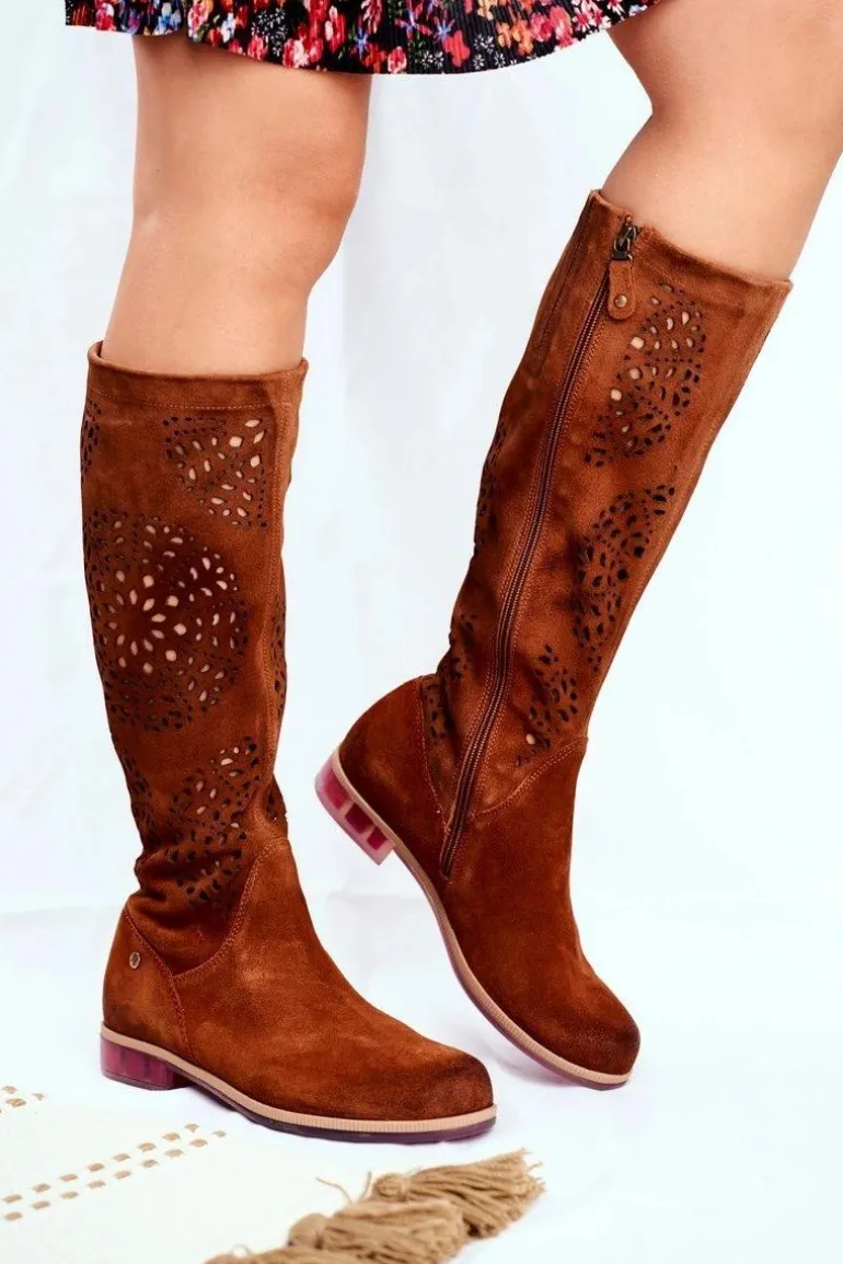 Damskie Kozaki Maciejka Skórzane Ażurowe Camel 04525-29