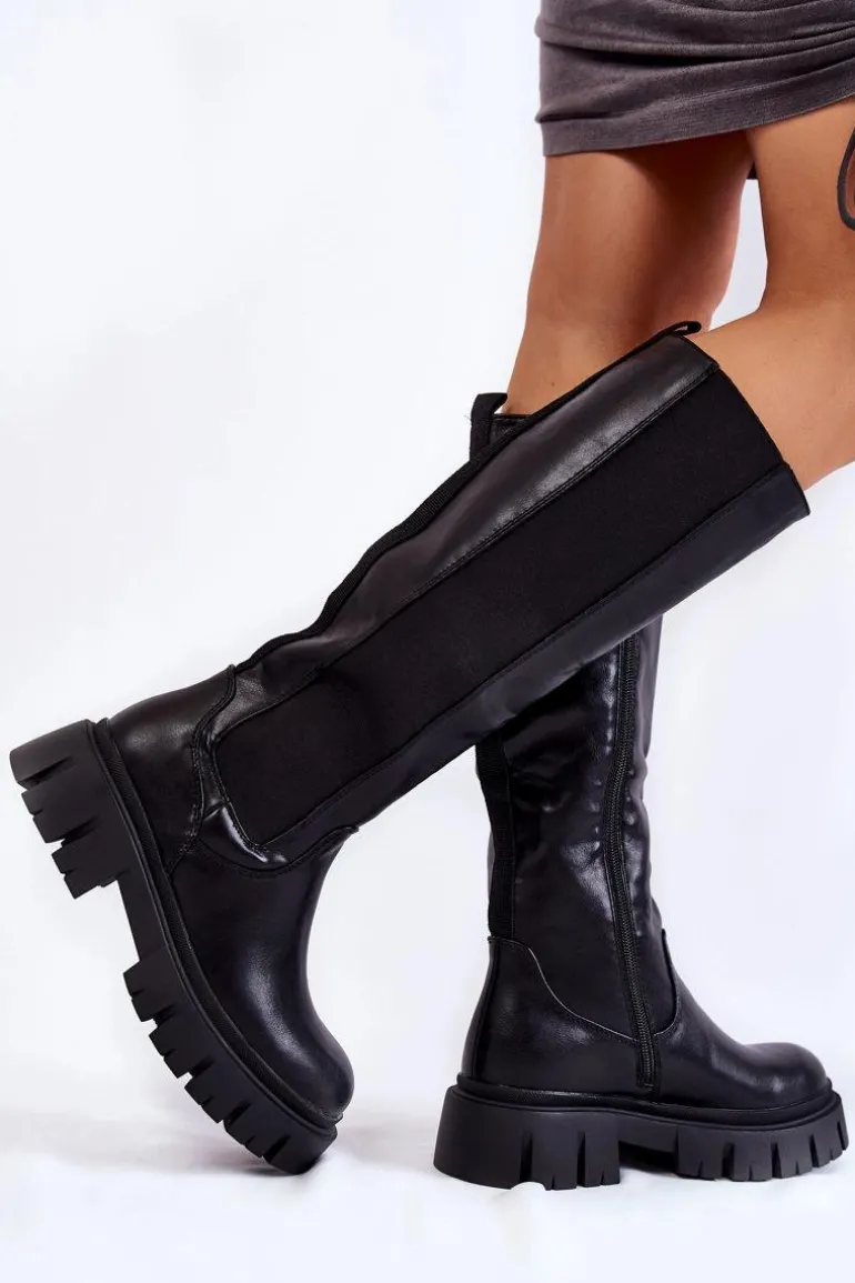Modne, damskie kozaki zostały wykonane z wysokiej jakości eko skórzanych materiałów. Posiadają suwak na całej długości cholewki oraz usztywniany zapiętek. Dodatkowo po zewnętrznej stronie znajduje się elastyczna wstawka. Kozaki zostały osadzone na płaskim obcasie i platformie ze żłobieniami. Model do kolana. Fason ten posiada ocieplenie w postaci miłego w dotyku, krótkiego futerka. Klasyczny fason sprawdzi się do wielu stylizacji! Przy wyborze rozmiaru prosimy kierować tabelą rozmiarów.