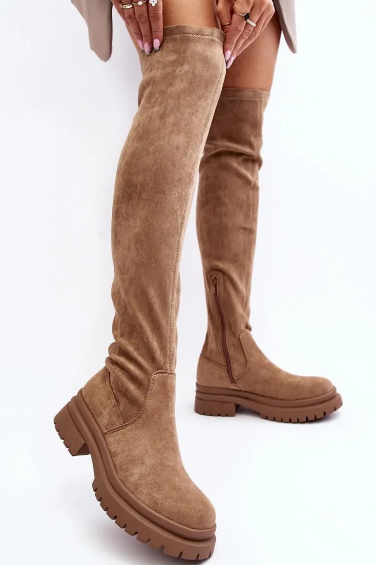 Damskie kozaki z cholewką za kolano. Wykonane z eko zamszu. Osadzone na masywnej podeszwie i płaskim obcasie. Noski zaokrąglone. Usztywniony zapiętek. Wkładka lekko ocieplona kocem obuwniczym. Klasyczny fason sprawdzi się do wielu jesienno-zimowych stylizacji! Przy wyborze rozmiaru prosimy kierować tabelą rozmiarów.