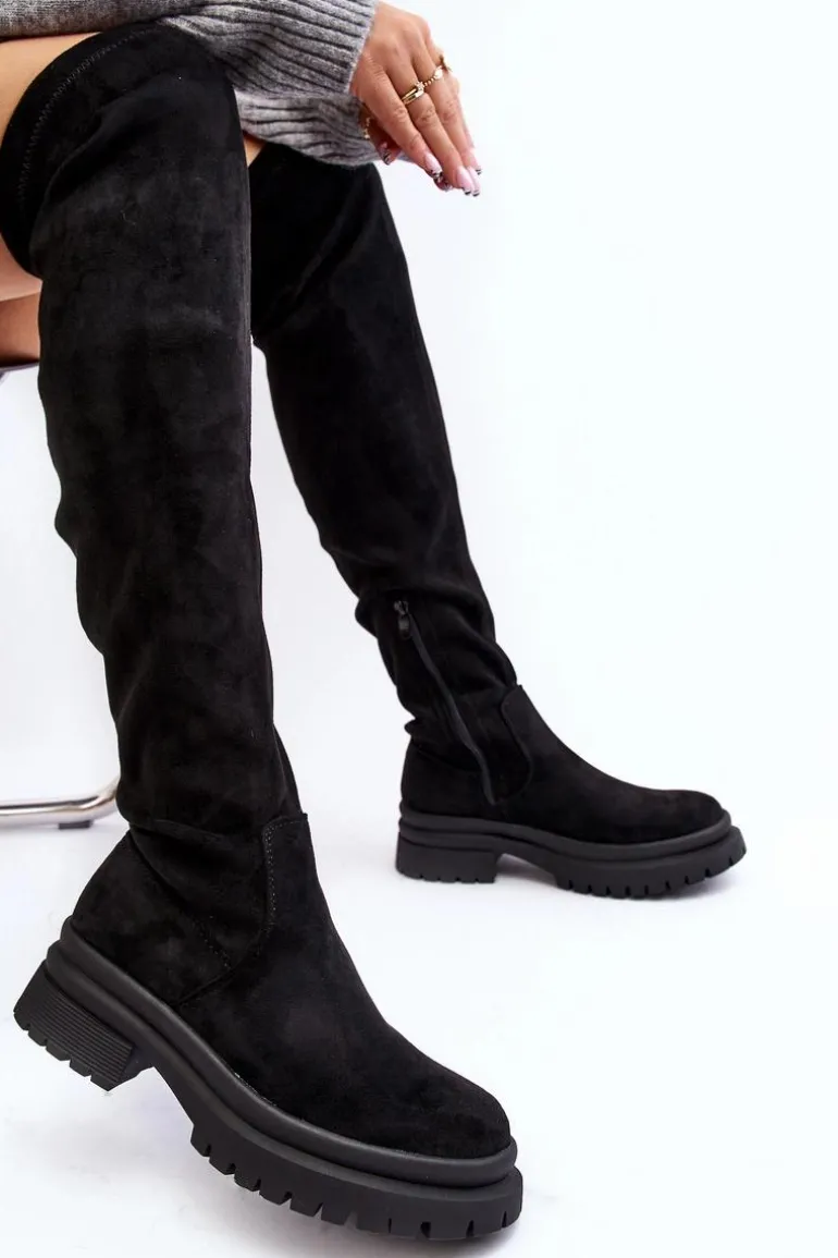 Damskie kozaki z cholewką za kolano. Wykonane z eko zamszu. Osadzone na masywnej podeszwie i płaskim obcasie. Noski zaokrąglone. Usztywniony zapiętek. Wkładka lekko ocieplona kocem obuwniczym. Klasyczny fason sprawdzi się do wielu jesienno-zimowych stylizacji! Przy wyborze rozmiaru prosimy kierować tabelą rozmiarów.
