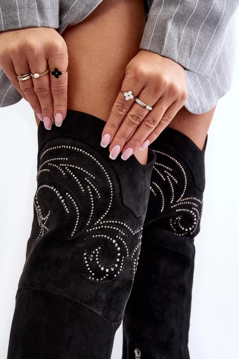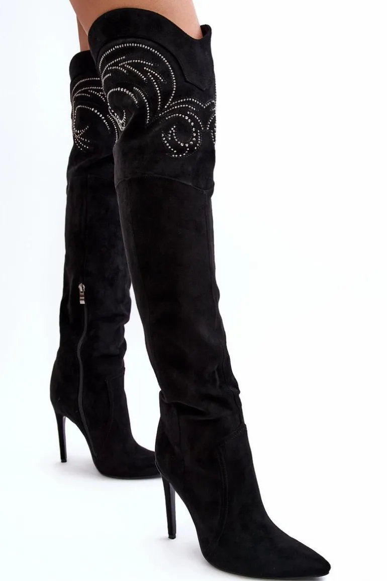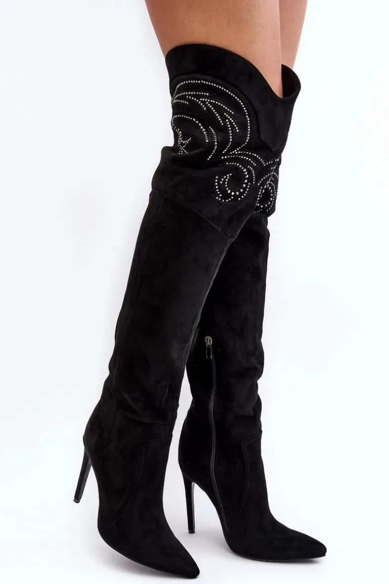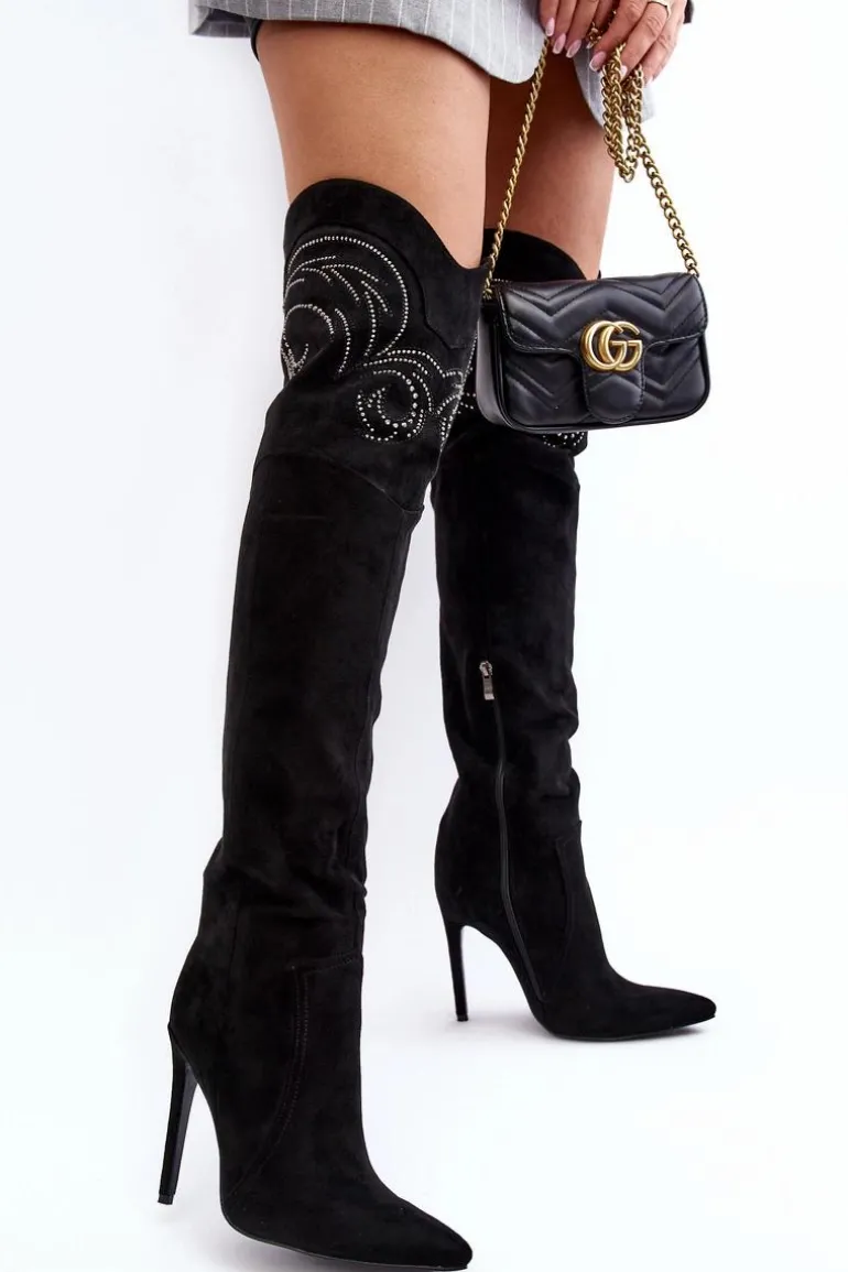 Kozaki damskie z wysoką cholewką za kolano. Osadzone na obcasie w postaci szpilki. Wykonane z eko zamszu. Model wsuwany z dodatkowym zapięciem na suwak. Noski w szpic optycznie wysmuklą nogi. Wnętrze lekko ocieplone, miłym w dotyku kocem obuwniczym. Zapiętek usztywniony. Góra cholewki ozdobiona przeszyciami i dżetami. Koniecznie musisz mieć ten model w swojej garderobie! Przy wyborze rozmiaru prosimy kierować tabelą rozmiarów.