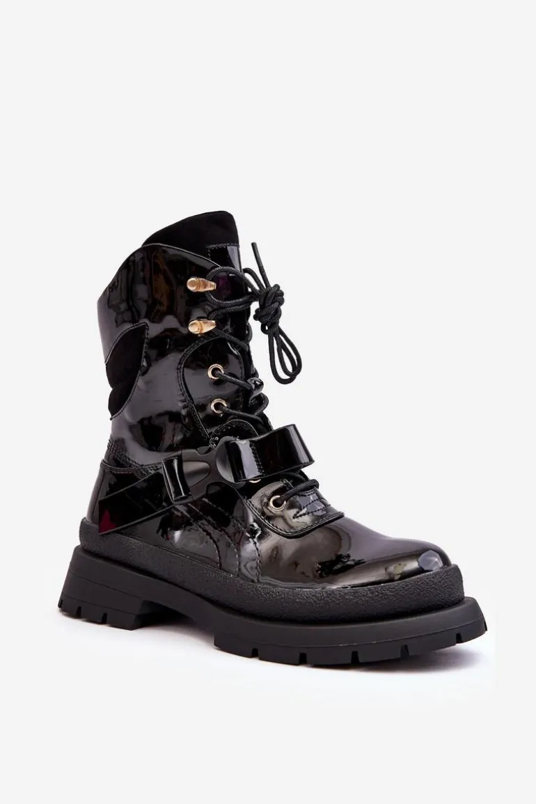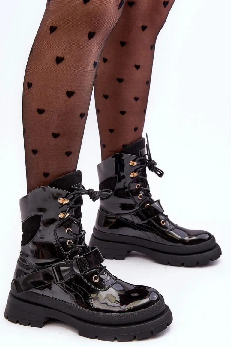 Damskie botki w stylu workerów zostały wykonane z eko skóry. Osadzone na płaskim obcasie oraz platformie ze żłobieniami. Model klasycznie sznurowany. Cholewka ozdobiona paskiem. Noski zaokrąglone. Zapiętek usztywniony. Ten model na pewno wykorzystasz w wielu stylizacjach! Przy wyborze rozmiaru prosimy sugerować się tabelą rozmiarów.