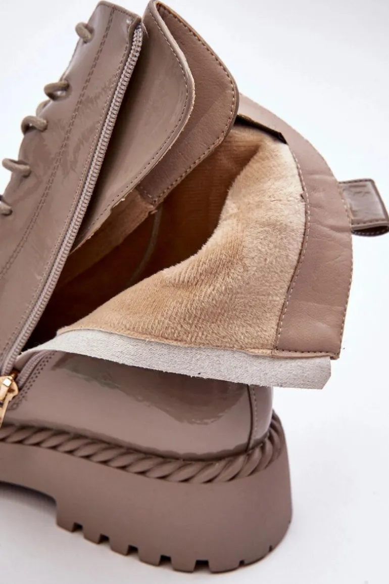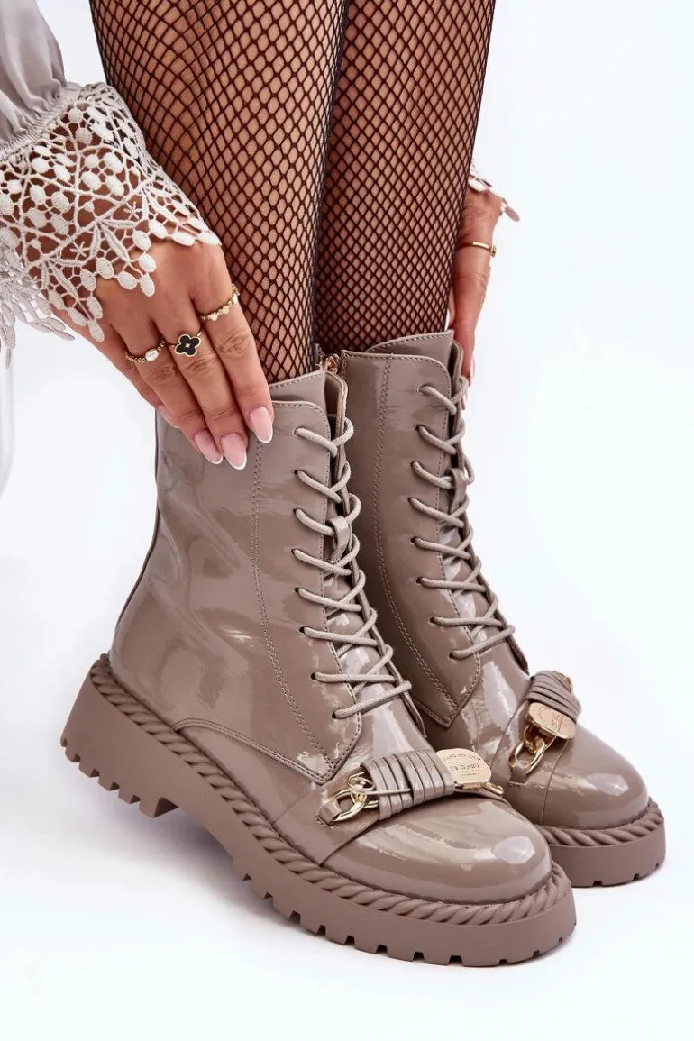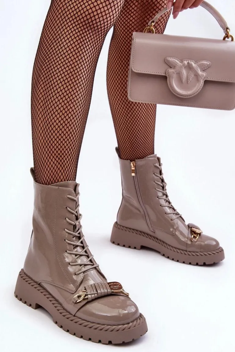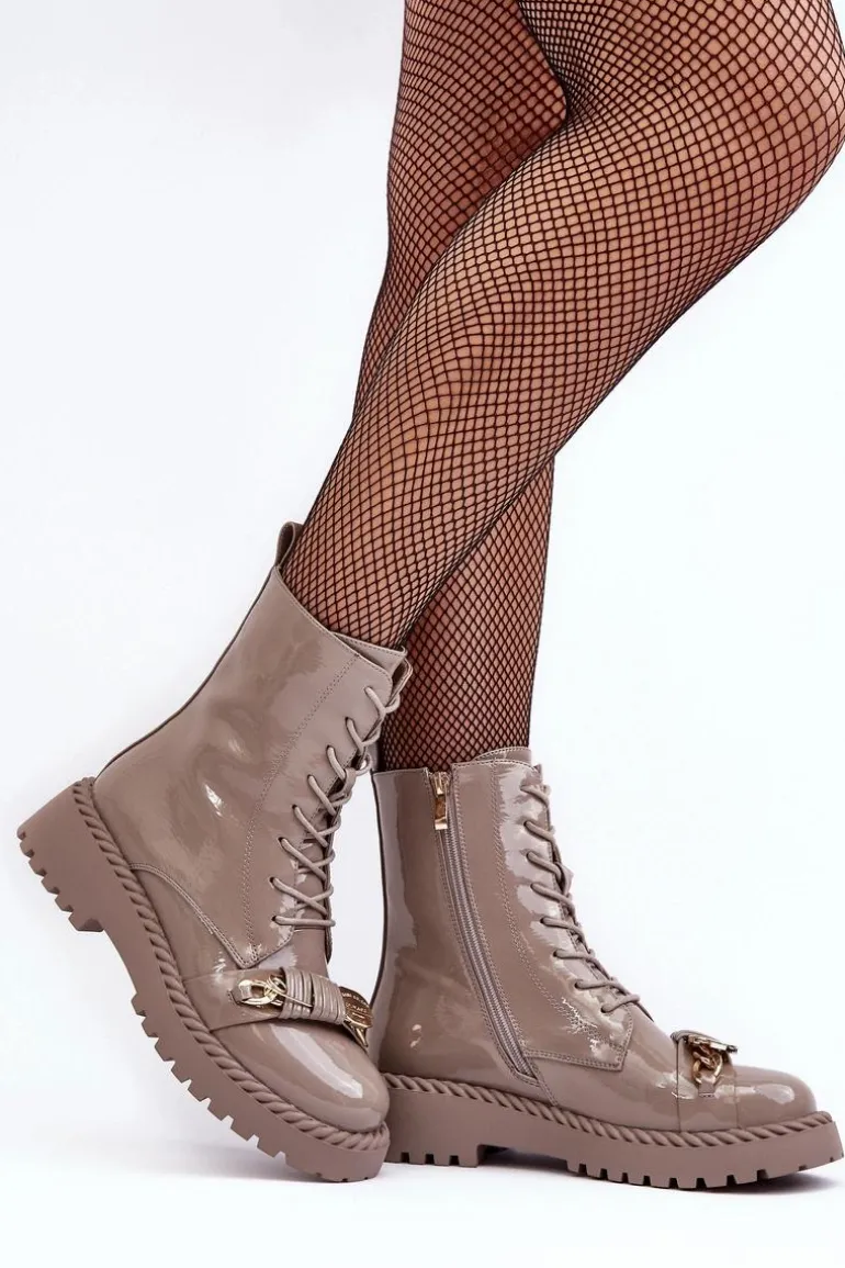 Damskie botki w stylu workerów zostały wykonane z wysokiej jakości eko skóry. Posiadają suwak z boku cholewki ułatwiający zakładanie obuwia. Botki osadzono na płaskim obcasie oraz delikatnej platformie ze żłobieniami. Posiadają w środku ocieplenie kocem obuwniczym. Z przodu złote ozdoby z tworzywa sztucznego. Ten model na pewno wykorzystasz w wielu stylizacjach! Przy wyborze rozmiaru prosimy sugerować się tabelą rozmiarów.