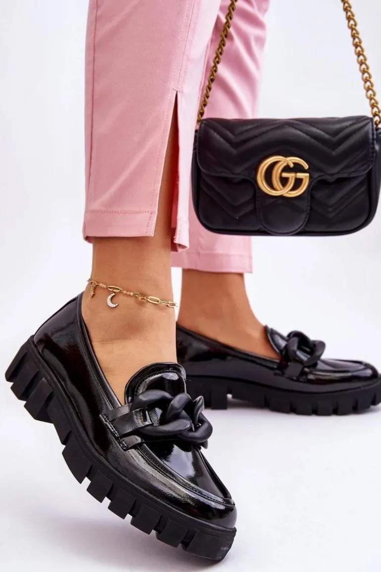 Mokasyny damskie na platformie i płaskim obcasie ze żłobieniami powinny być Twoje! Podeszwa została wykonana z gumowego tworzywa, dzięki któremu jest dodatkowo antypoślizgowa. Miękka wkładka z naturalnej skóry oraz wzmacniany zapiętek zapewni komfortowe użytkowanie. Mokasyny posiadają z przodu ozdobny łańcuch z tworzywa sztucznego. Przy wyborze rozmiaru prosimy sugerować się tabelą rozmiarów.