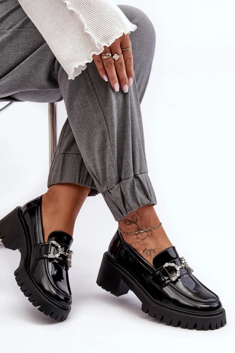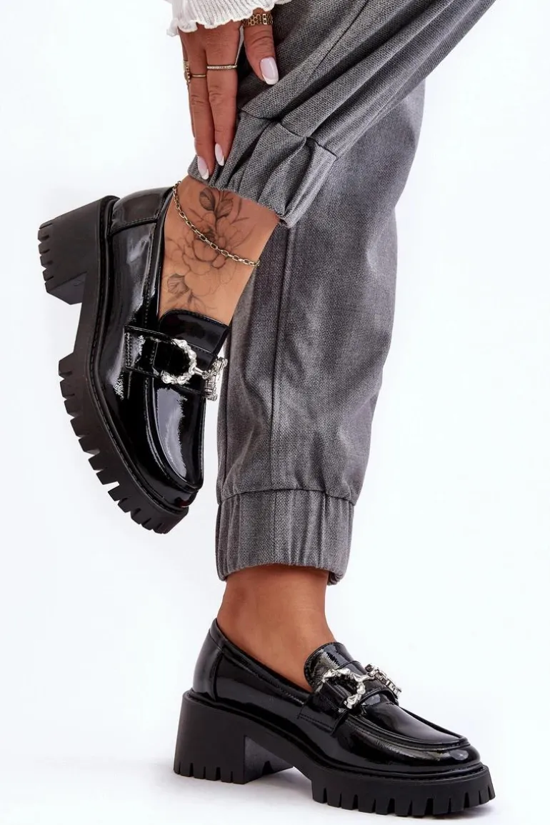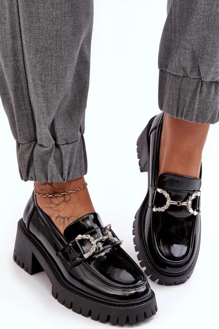 Półbuty damskie wykonane z eko skóry. Osadzone na masywnym, niskim obcasie i platformie. Z przodu na pasku biżuteryjna ozdoba. Noski zaokrąglone. Usztywniony zapiętek. Z tym modelem stworzysz wiele świetnych jesiennych stylizacji! Przy wyborze rozmiaru prosimy sugerować się tabelą rozmiarów.