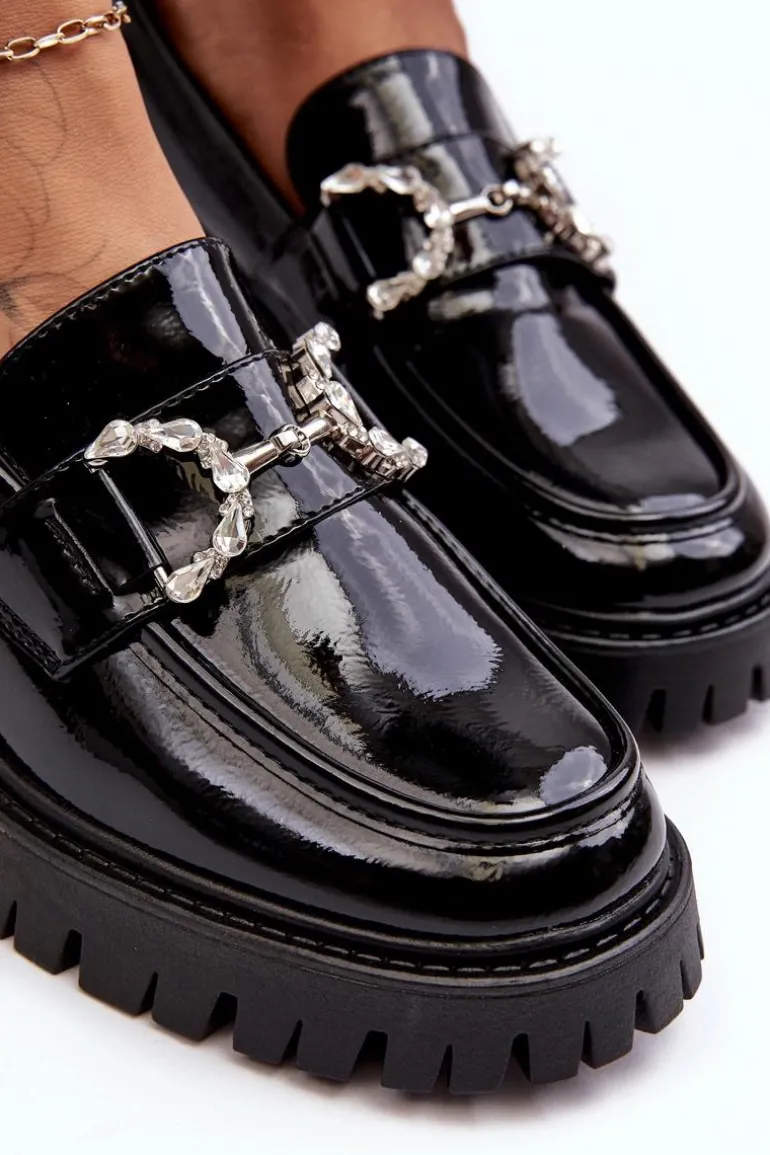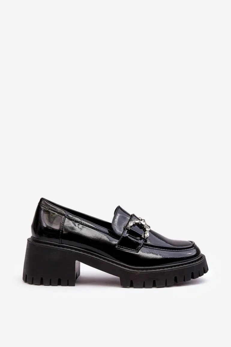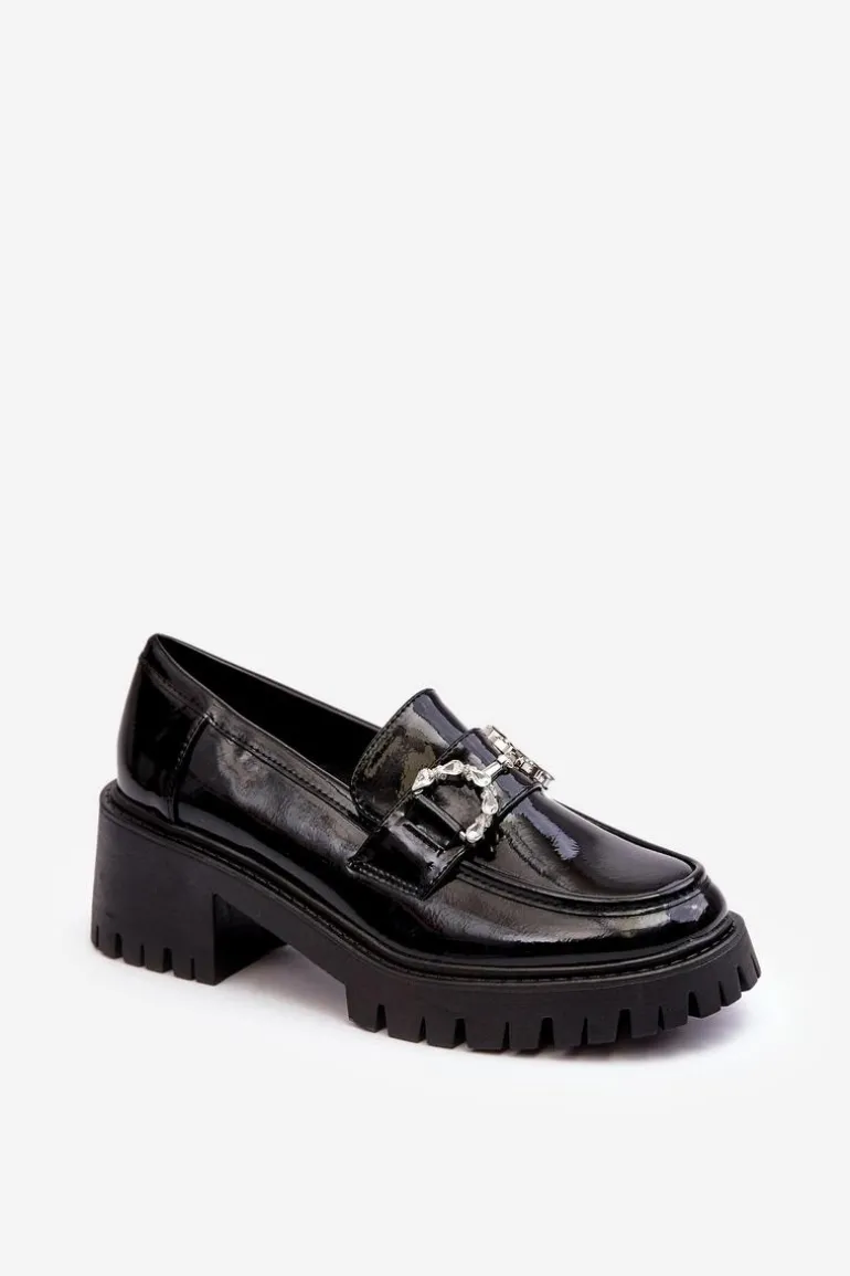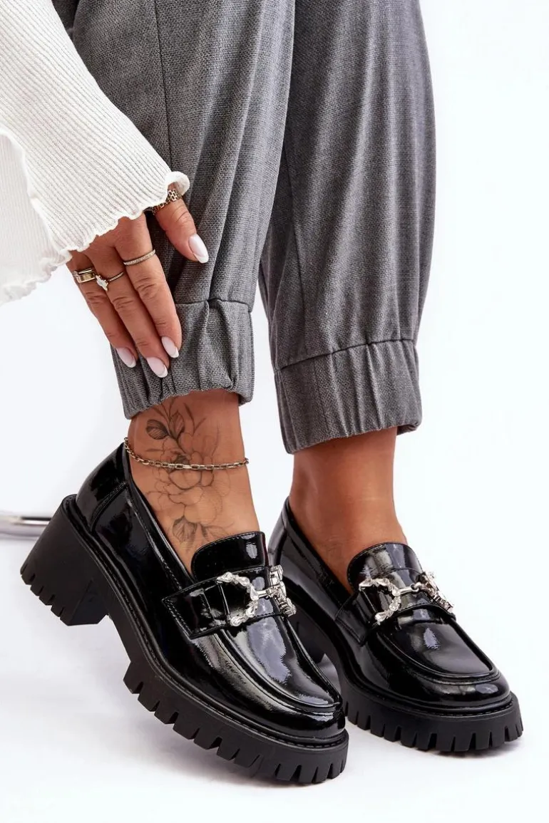 Półbuty damskie wykonane z eko skóry. Osadzone na masywnym, niskim obcasie i platformie. Z przodu na pasku biżuteryjna ozdoba. Noski zaokrąglone. Usztywniony zapiętek. Z tym modelem stworzysz wiele świetnych jesiennych stylizacji! Przy wyborze rozmiaru prosimy sugerować się tabelą rozmiarów.