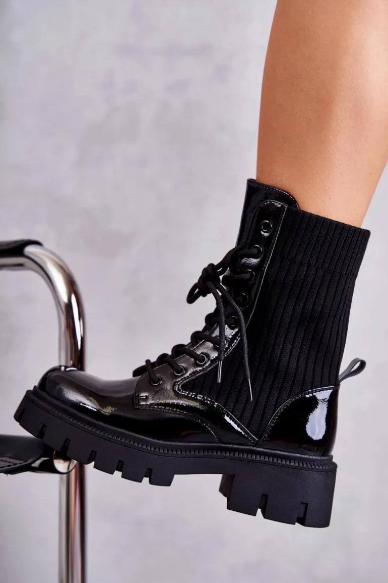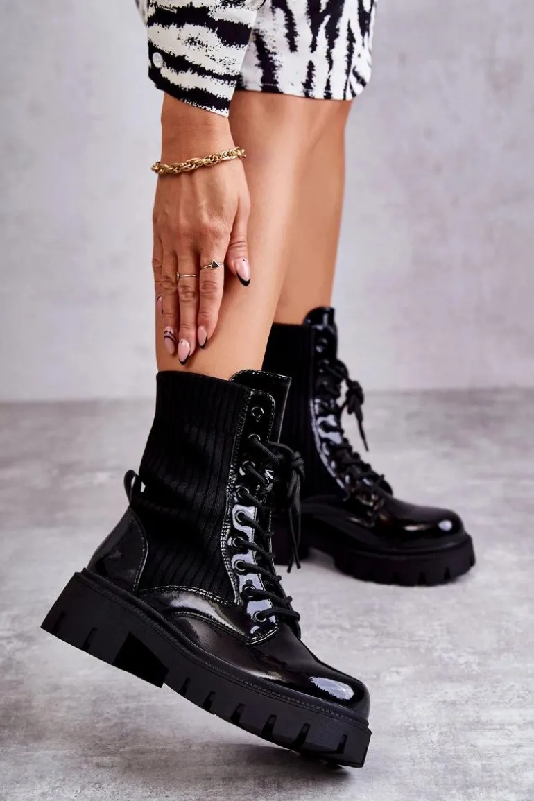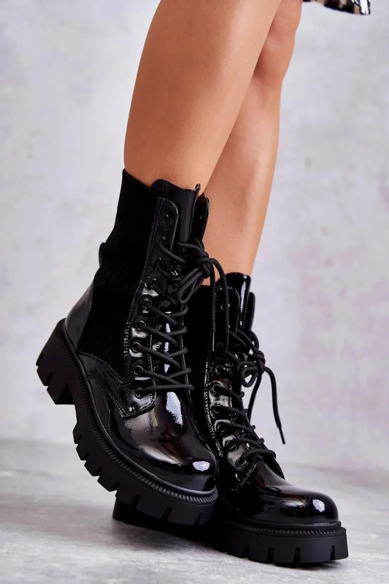 Modne botki damskie zostały wykonane z połączenia eko skóry oraz materiału tekstylnego w formie skarpety. Model klasycznie sznurowany. Botki zostały osadzone na platformie oraz płaskim obcasie. Ocieplone częściowo — na języku oraz wkładce. Model z usztywnianym zapiętkiem. Idealnie będą komponować się z krótkimi sukienkami, spódniczkami, a także spodniami. Przy wyborze rozmiaru prosimy sugerować się tabelą rozmiarów.