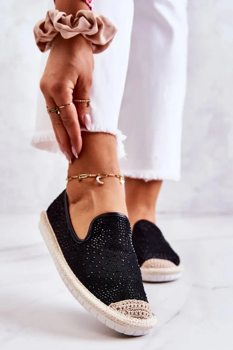 Klasyczne espadryle w nowoczesnym wydaniu! Wykonane z przewiewnego materiału tekstylnego z dżetami imitującymi cyrkonie. Osadzone na płaskiej podeszwie wykonanej z gumowego tworzywa. Dodatkowo są antypoślizgowe. Miękka, eko skórzana wkładka zapewni komfortowe użytkowanie. Przy podeszwie oraz na nosku znajduje się ozdobna plecionka. Model wsuwany, który wykorzystasz do wielu stylizacji! Koniecznie powinnaś je mieć! Podczas wyboru rozmiaru prosimy sugerować się tabelą rozmiarów.