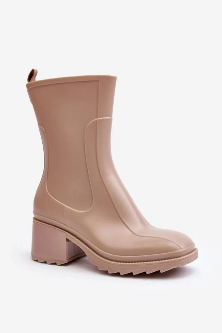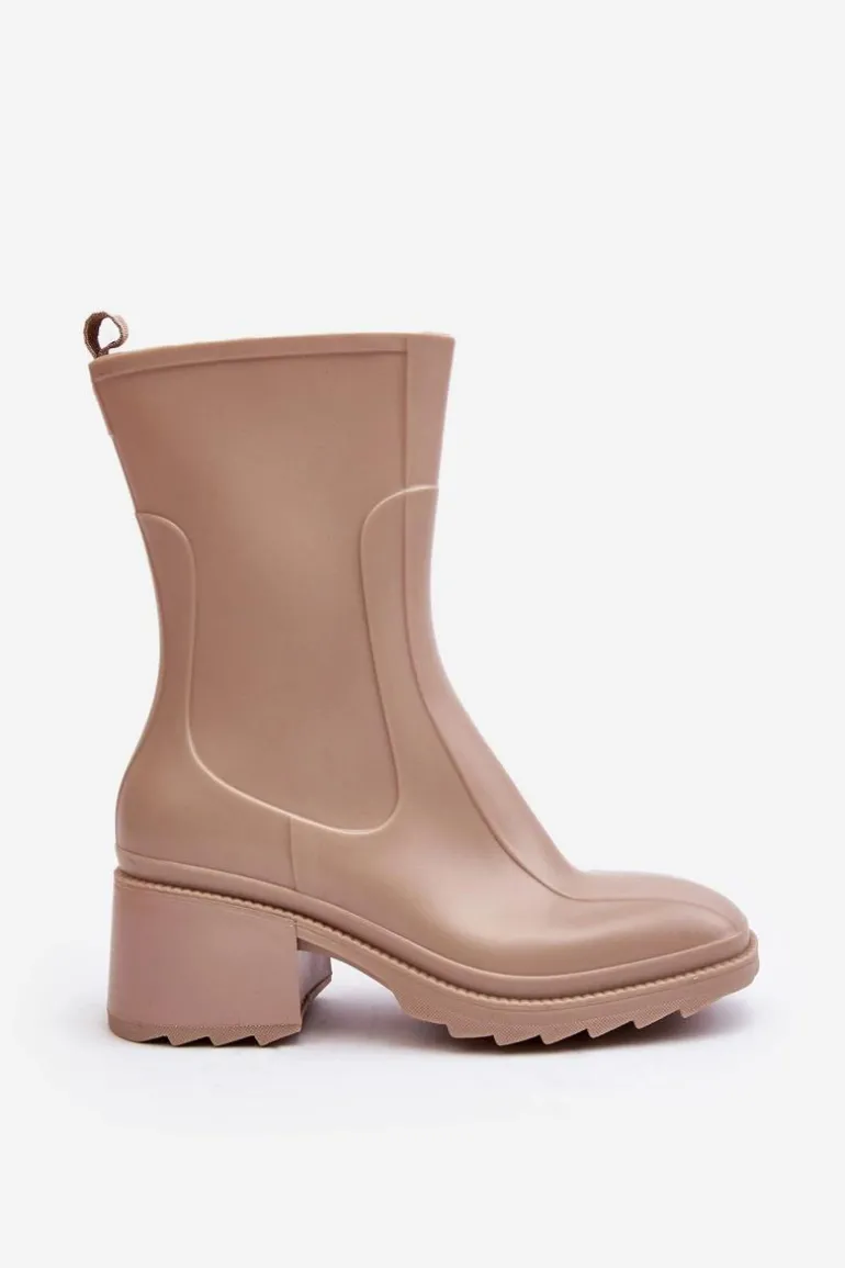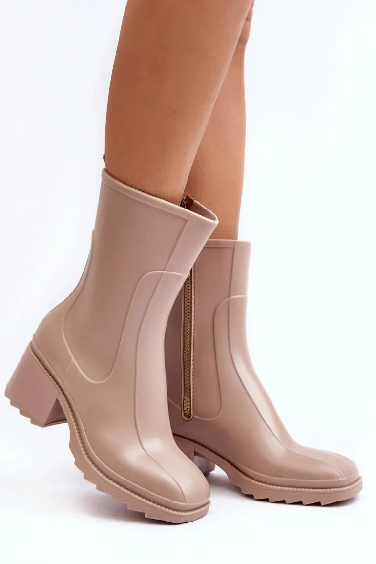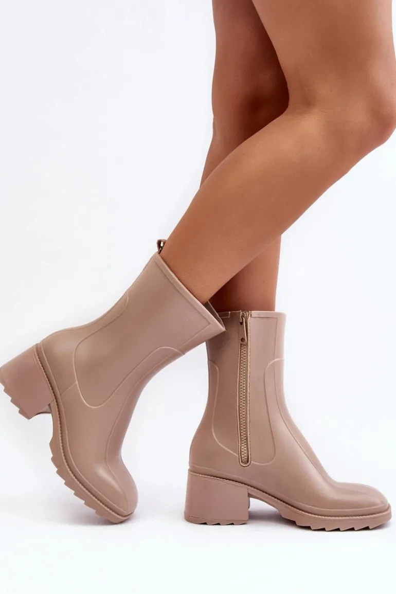 Kalosze damskie wykonane z gumowego tworzywa. Osadzone na masywnym obcasie. Model zapinany na suwak. Noski w kwadrat. Miękka wkładka z tkaniny zapewni komfort podczas użytkowania obuwia. Idealne na jesienne, deszczowe dni! Przy wyborze rozmiaru prosimy sugerować się tabelą rozmiarów.