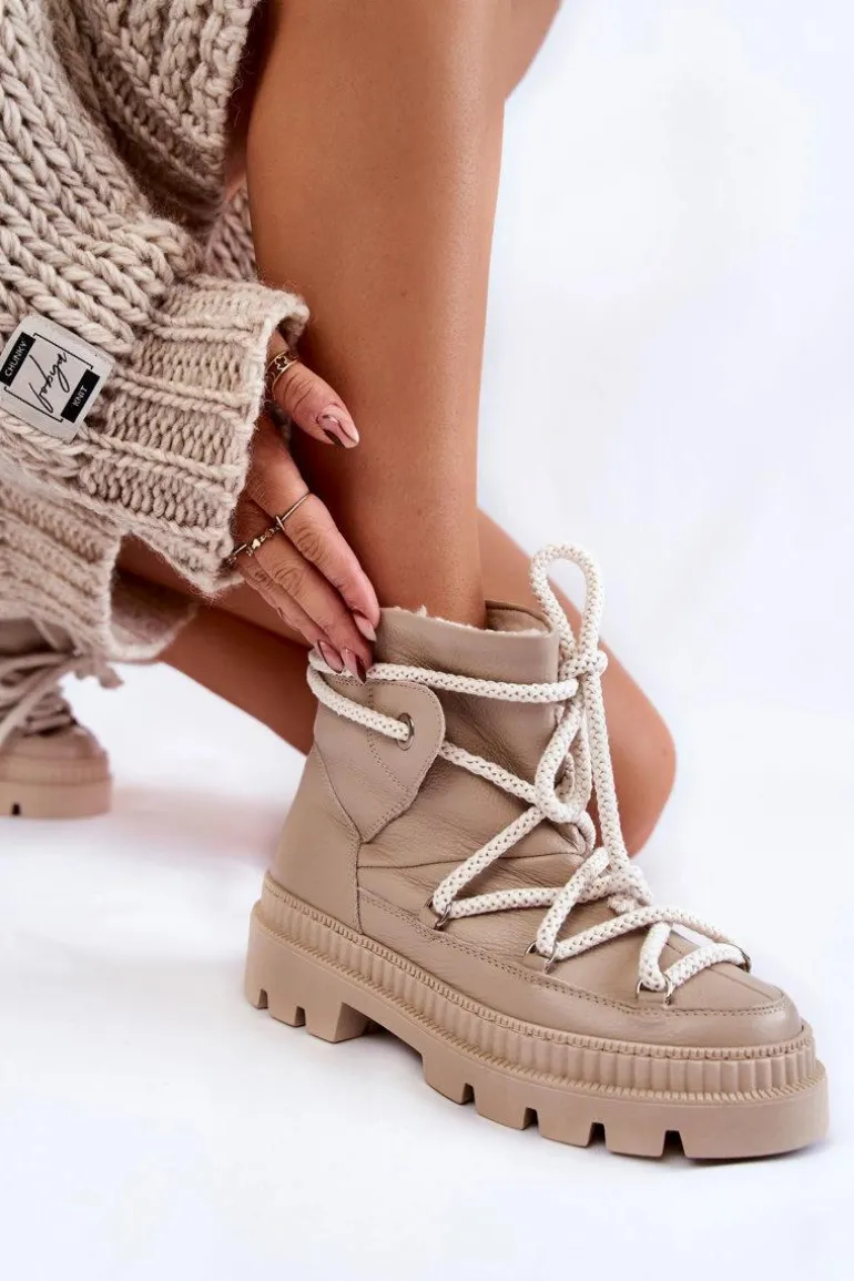 Świetne, damskie śniegowce zostały wykonane z wysokiej jakości skór. Model posiada grube, solidne sznurowanie. Botki zostały osadzone na płaskim obcasie oraz platformie ze żłobieniami. Śniegowce posiadają ocieplenie w postaci futerka oraz usztywniany zapiętek. Ten model z pewnością przyda się każdej miłośniczce ciepłego i wygodnego obuwia! Przy wyborze rozmiaru prosimy sugerować się tabelą rozmiarów.