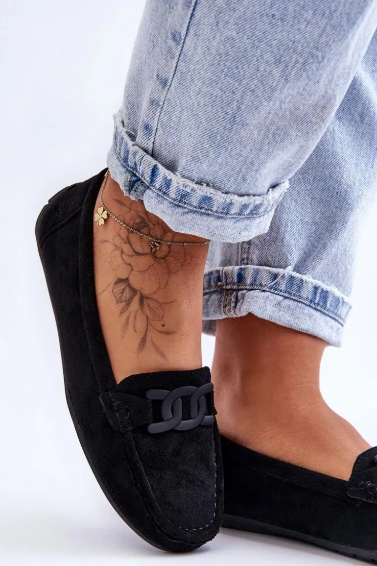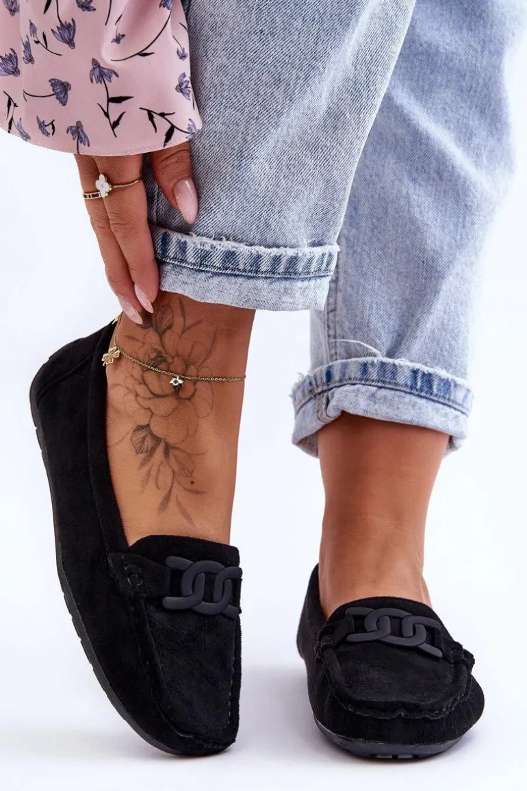 Damskie mokasyny powinny znaleźć się w każdej kobiecej szafie! Ten model został wykonany z miłego w dotyku eko zamszu. Na przodzie znajduje się ozdoba z tworzywa sztucznego. Mokasyny osadzono na antypoślizgowej podeszwie. Miękka wkładka z eko skóry zapewni komfort podczas użytkowania obuwia. Dodatkowo jest delikatnie perforowana. Przy wyborze rozmiaru prosimy sugerować się tabelą rozmiarów.