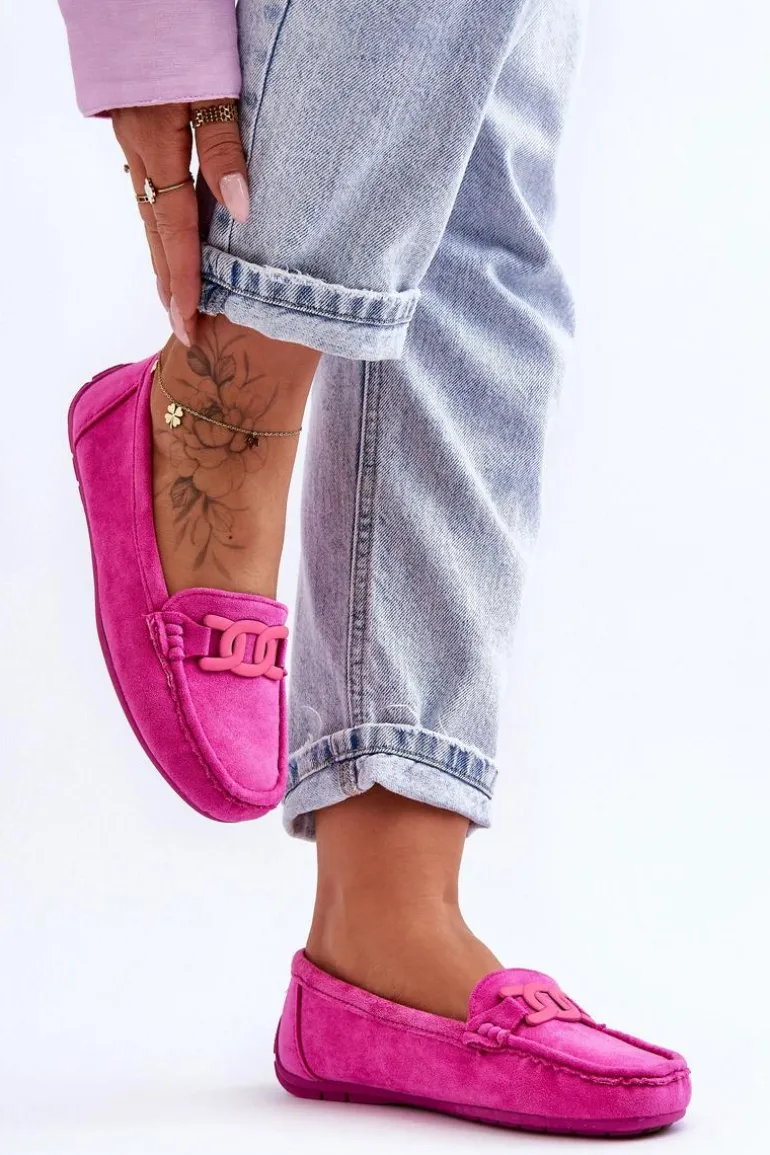 Damskie mokasyny powinny znaleźć się w każdej kobiecej szafie! Ten model został wykonany z miłego w dotyku eko zamszu. Na przodzie znajduje się ozdoba z tworzywa sztucznego. Mokasyny osadzono na antypoślizgowej podeszwie. Miękka wkładka z eko skóry zapewni komfort podczas użytkowania obuwia. Dodatkowo jest delikatnie perforowana. Przy wyborze rozmiaru prosimy sugerować się tabelą rozmiarów.