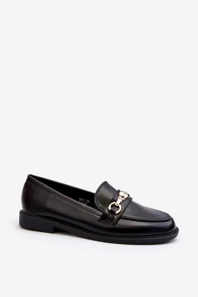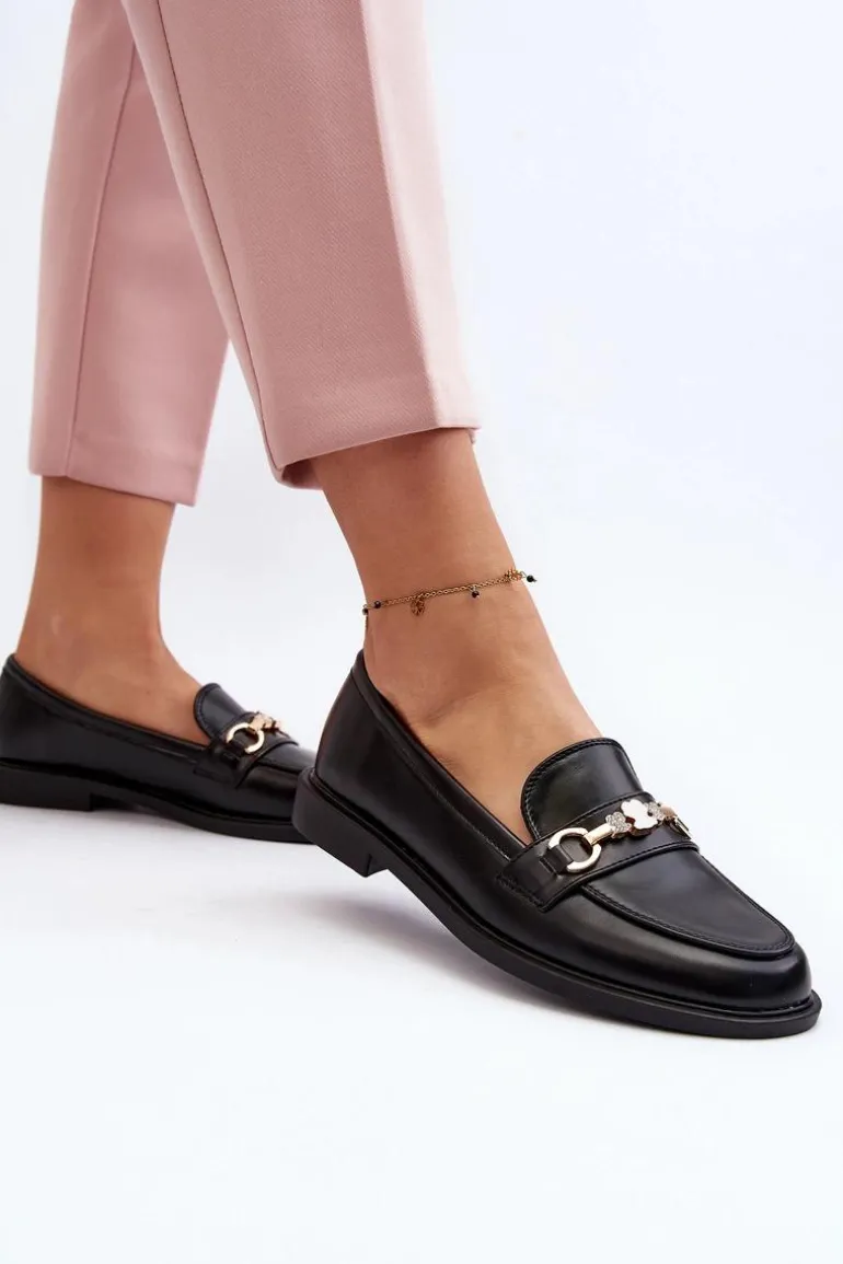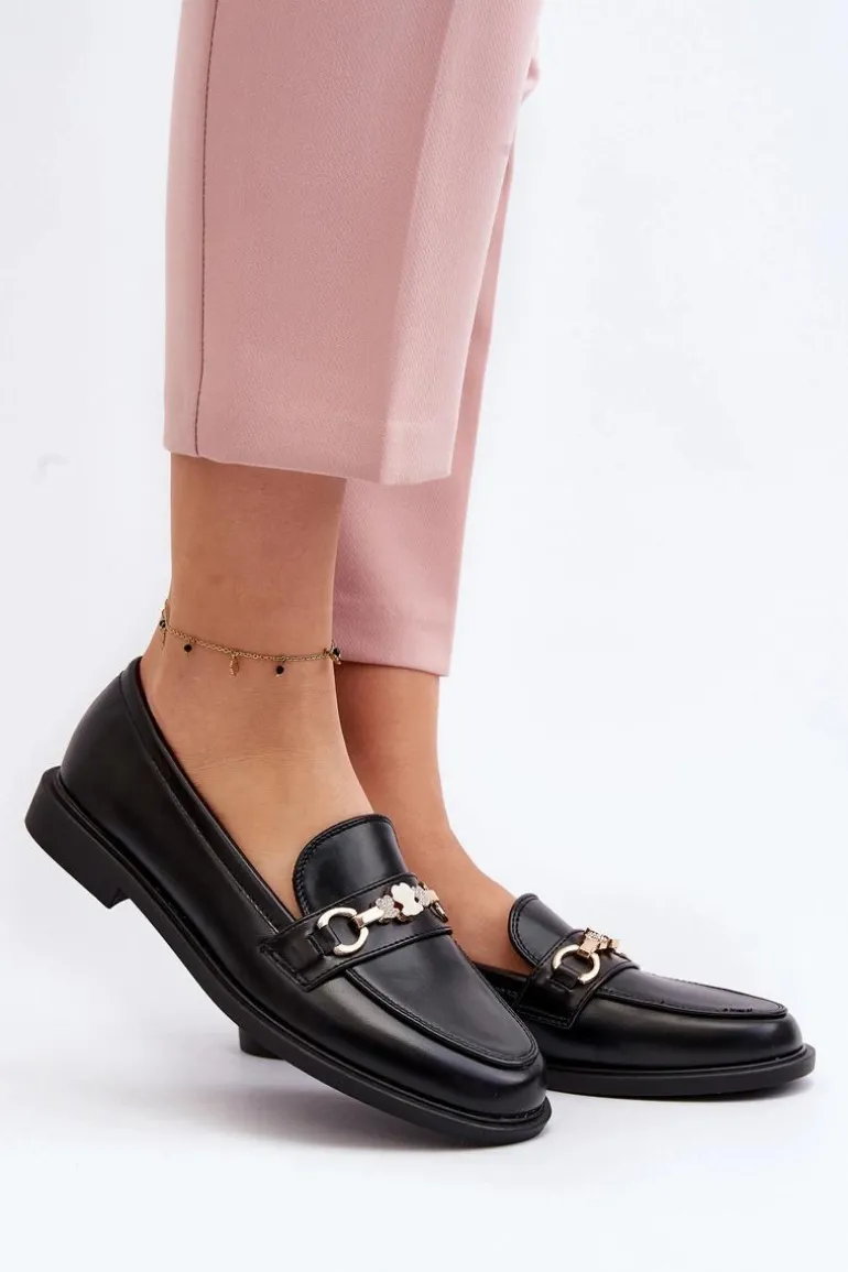 Mokasyny damskie z ozdobą na pasku. Wykonane z eko skóry. Osadzone na płaskim obcasie. Noski zaokrąglone. Ten modny fason dopełni wiele wiosennych stylizacji! Przy wyborze rozmiaru prosimy sugerować się tabelą rozmiarów.