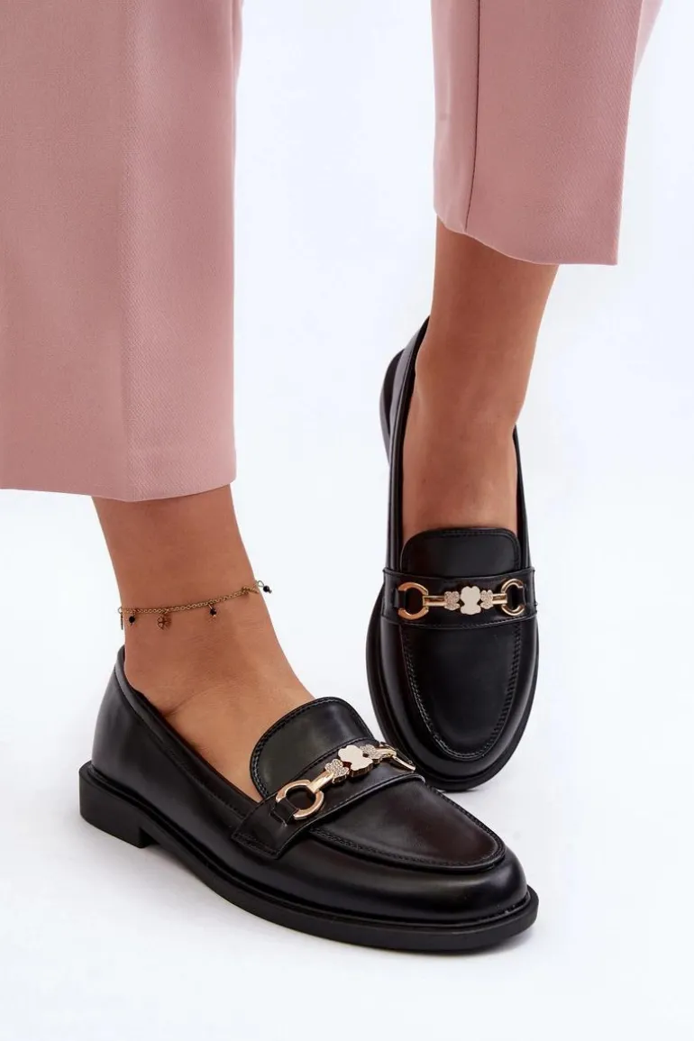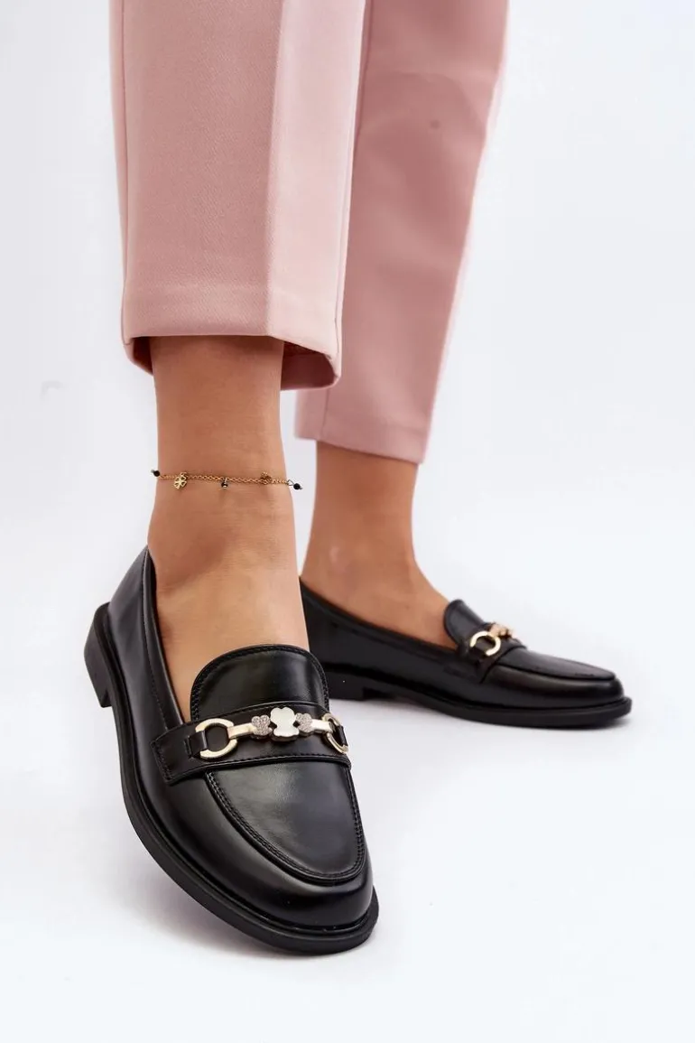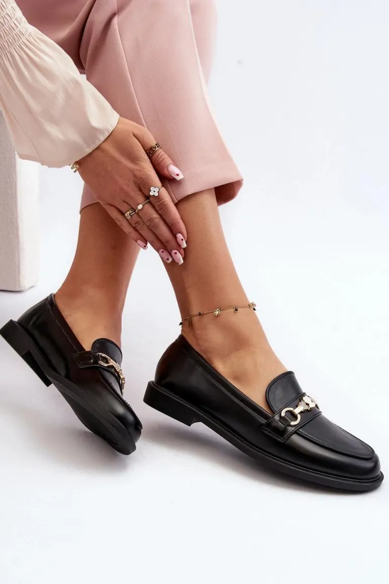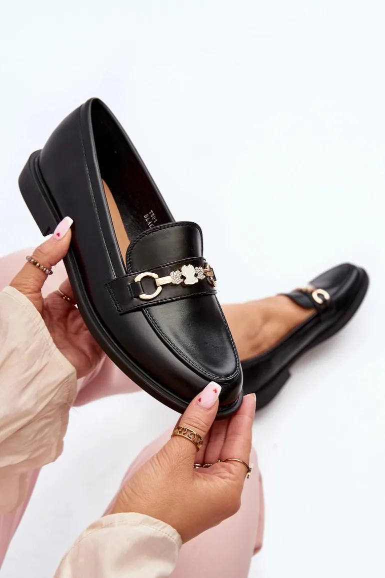 Mokasyny damskie z ozdobą na pasku. Wykonane z eko skóry. Osadzone na płaskim obcasie. Noski zaokrąglone. Ten modny fason dopełni wiele wiosennych stylizacji! Przy wyborze rozmiaru prosimy sugerować się tabelą rozmiarów.