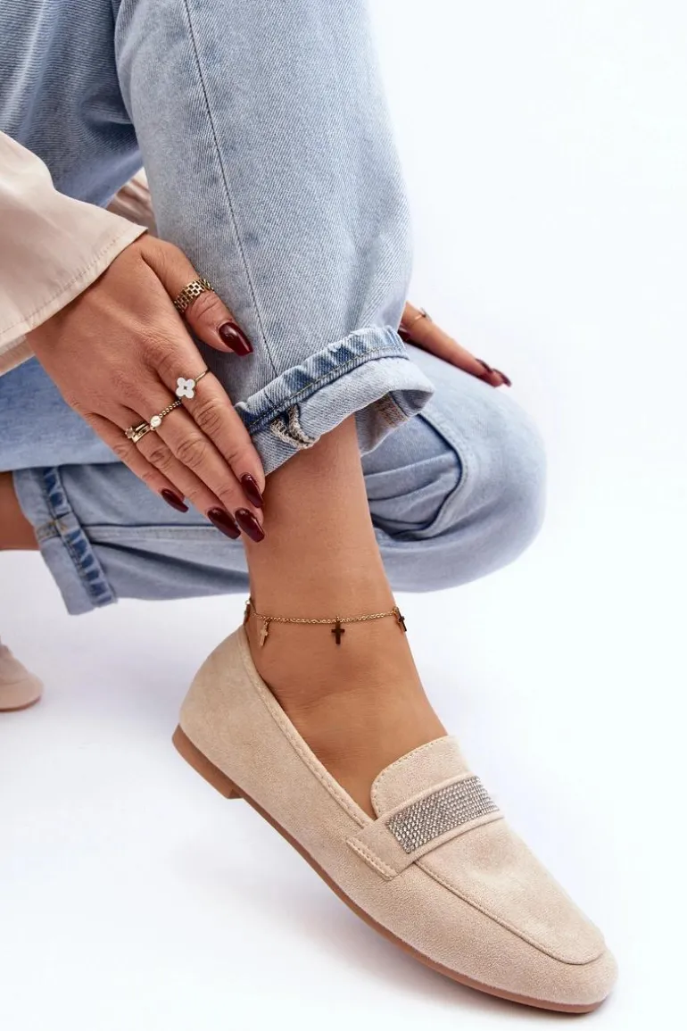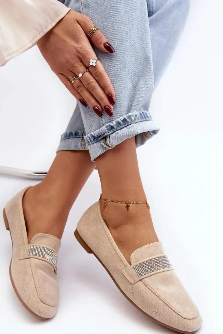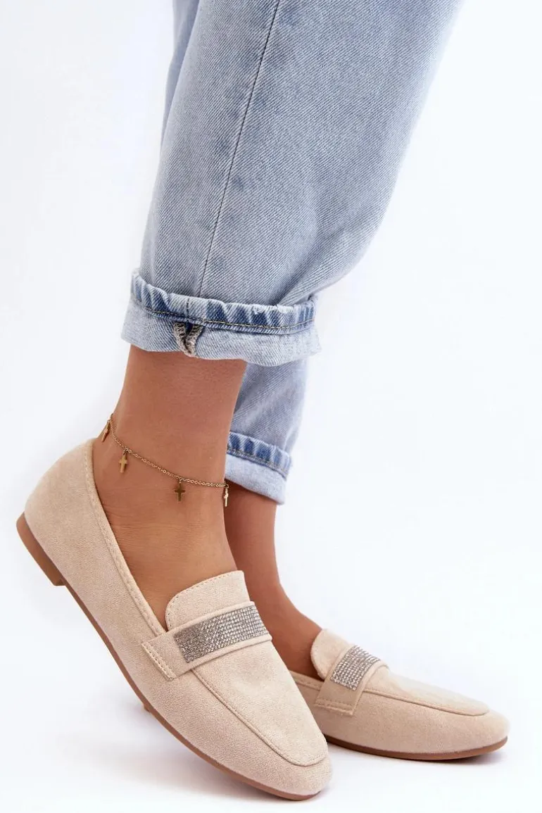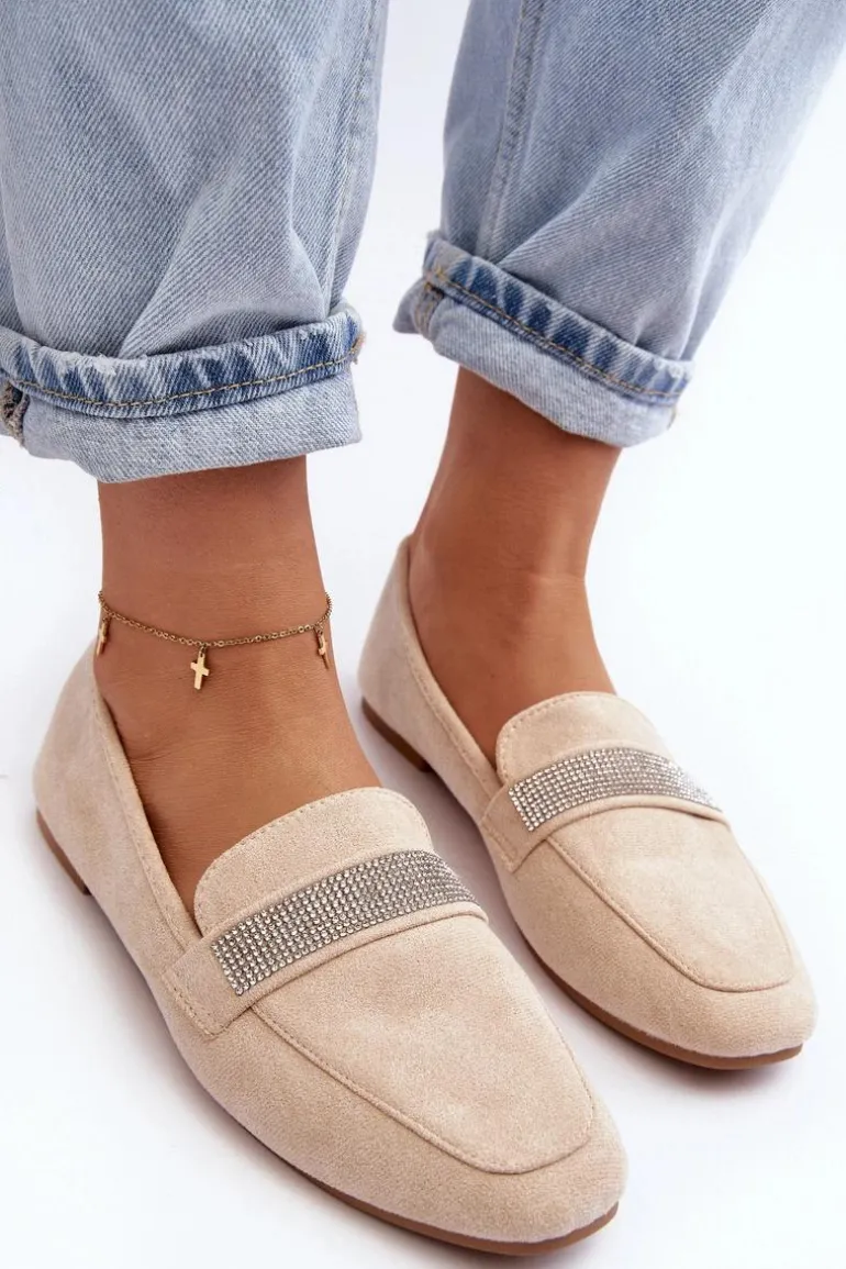 Mokasyny damskie wykonane z eko zamszu. Osadzone na płaskim obcasie. Noski zaokrąglone. Z przodu na pasku liczne, małe cyrkonie. Miękka i profilowana wkładka z eko skóry gwarantuje komfort noszenia przez cały dzień. Stylowe mokasyny to niezbędny element kobiecej garderoby! Koniecznie musisz je mieć! Przy wyborze rozmiaru prosimy sugerować się tabelą rozmiarów.