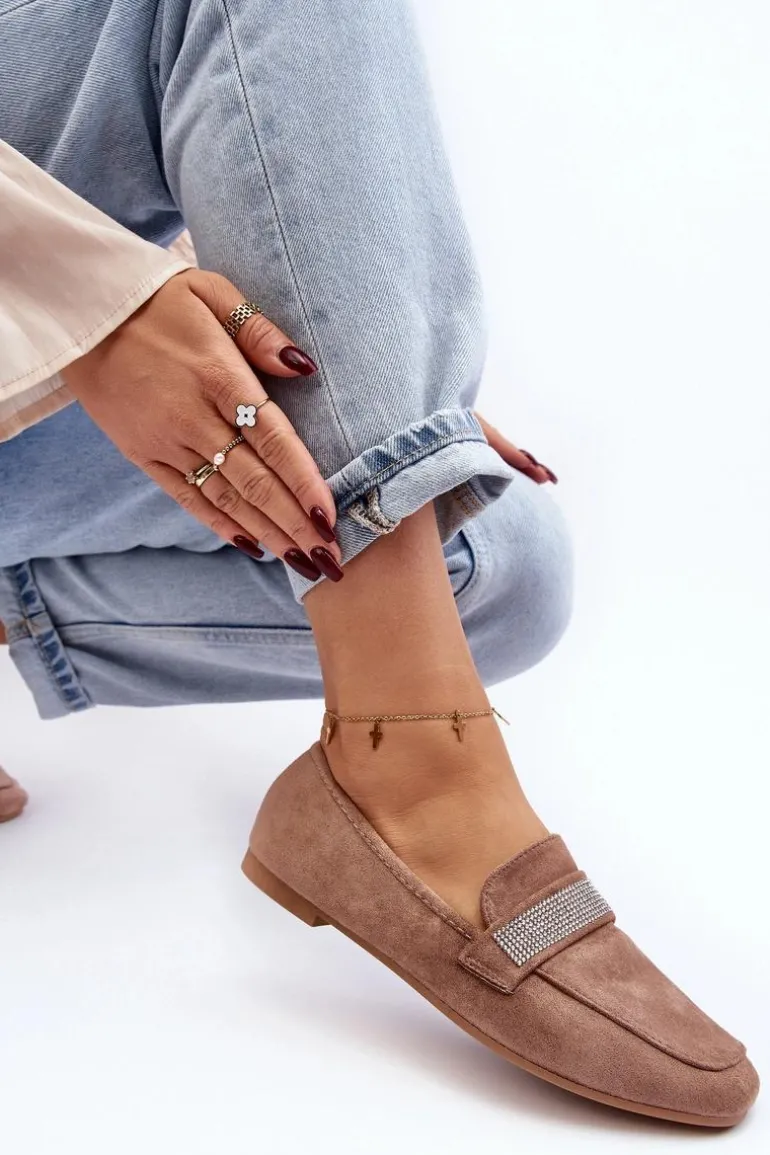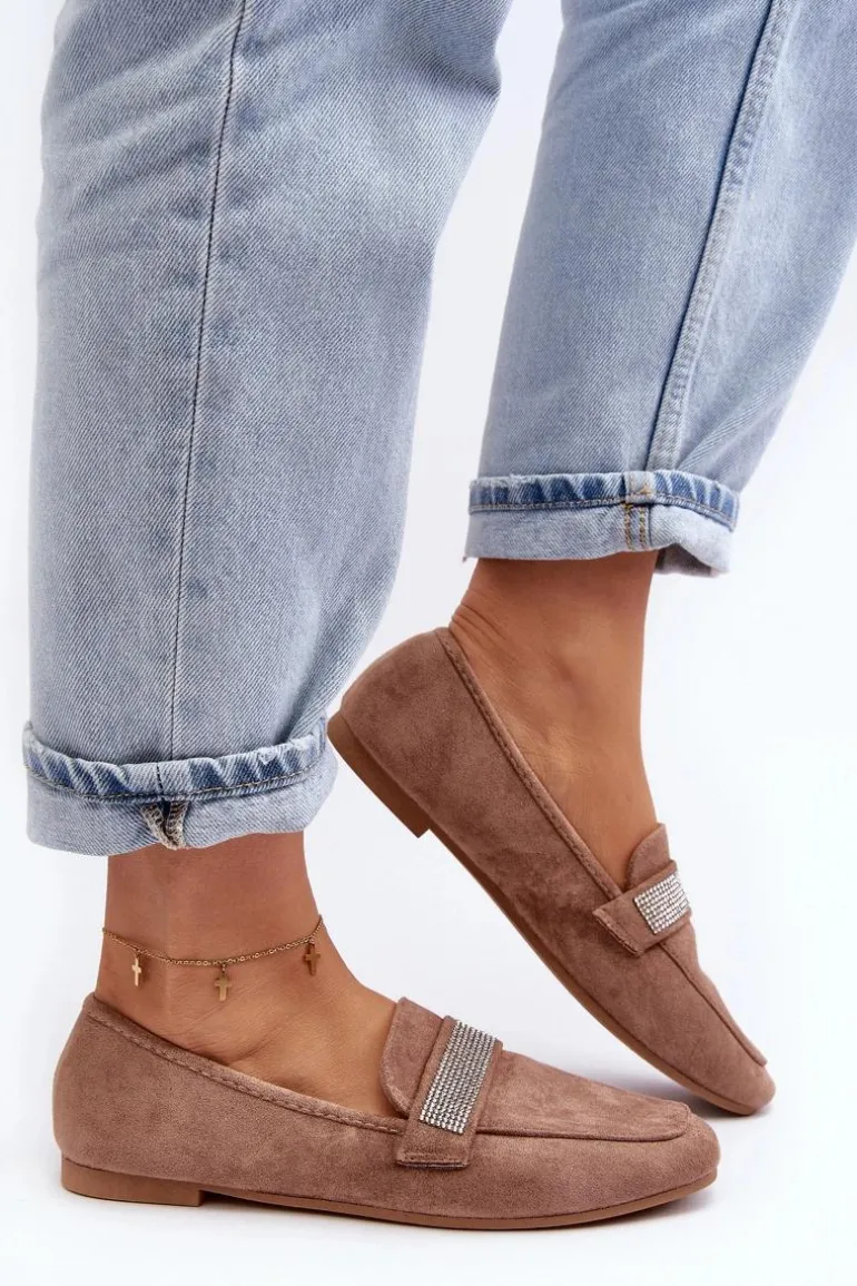 Mokasyny damskie wykonane z eko zamszu. Osadzone na płaskim obcasie. Noski zaokrąglone. Z przodu na pasku liczne, małe cyrkonie. Miękka i profilowana wkładka z eko skóry gwarantuje komfort noszenia przez cały dzień. Stylowe mokasyny to niezbędny element kobiecej garderoby! Koniecznie musisz je mieć! Przy wyborze rozmiaru prosimy sugerować się tabelą rozmiarów.