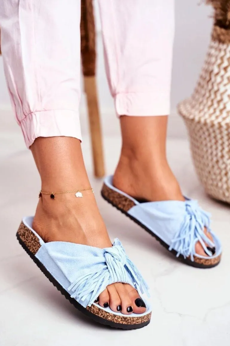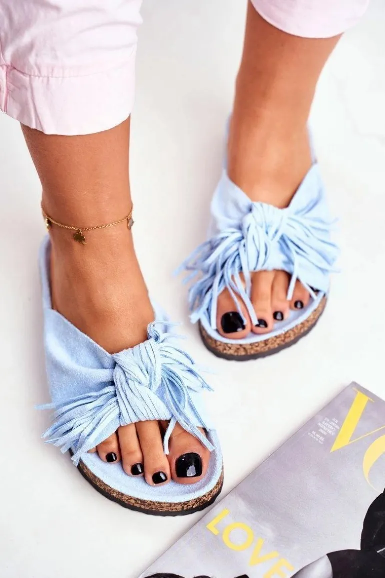 Damskie Niebieskie Klapki Na Korku Frędzle Marina