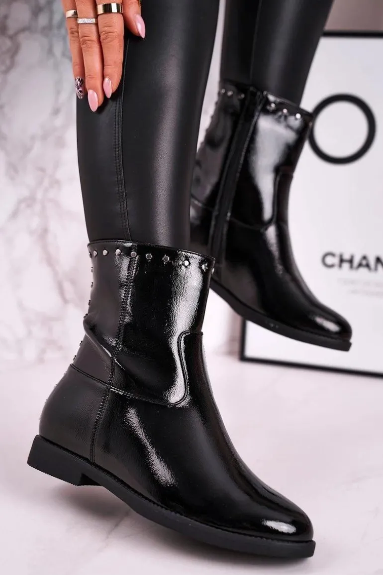 Damskie Ocieplane Botki Na Koturnie Lakierowane Czarne Performance