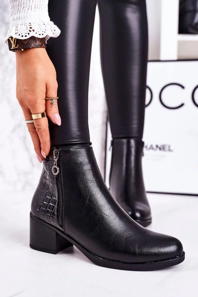 Przedstawiamy wygodne i stylowe botki na obcasie. Wnętrze butów ocieplone jest miłym w dotyku kocem obuwniczym. Botki wykonane są ze skóry ekologicznej. Dołącz do grona zachwyconych klientek i ciesz się nową parą butów! Przy wyborze rozmiaru prosimy sugerować się tabelą rozmiarów.