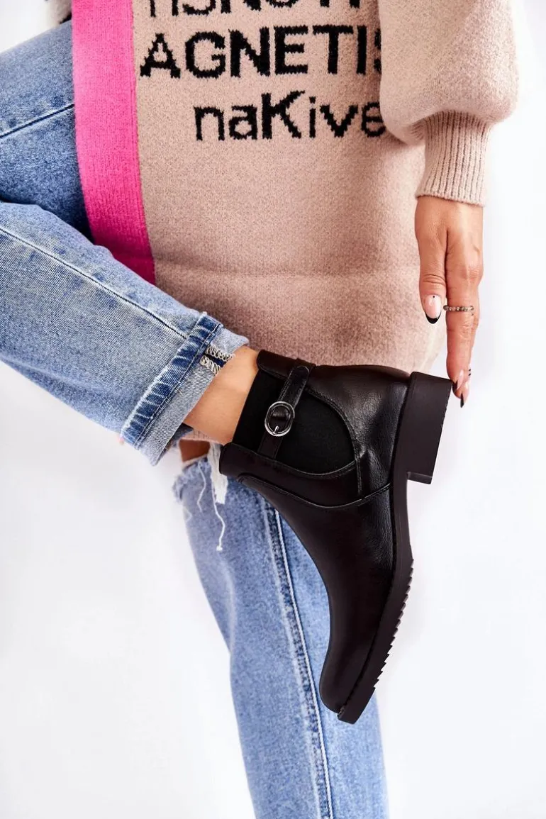 Damskie botki zostały wykonane z eko skóry. Posiadają ozdobną klamrę na cholewce oraz suwak ułatwiający zakładanie obuwia. Dodatkowo zapiętek w tych butach jest usztywniany. Osadzone na płaskim obcasie, co sprawia, że są niezwykle stabilne podczas użytkowania. Wnętrze botków zostało ocieplone miłym w dotyku kocem obuwniczym. Świetny model do wielu stylizacji! Przy wyborze rozmiaru prosimy sugerować się tabelą rozmiarów.